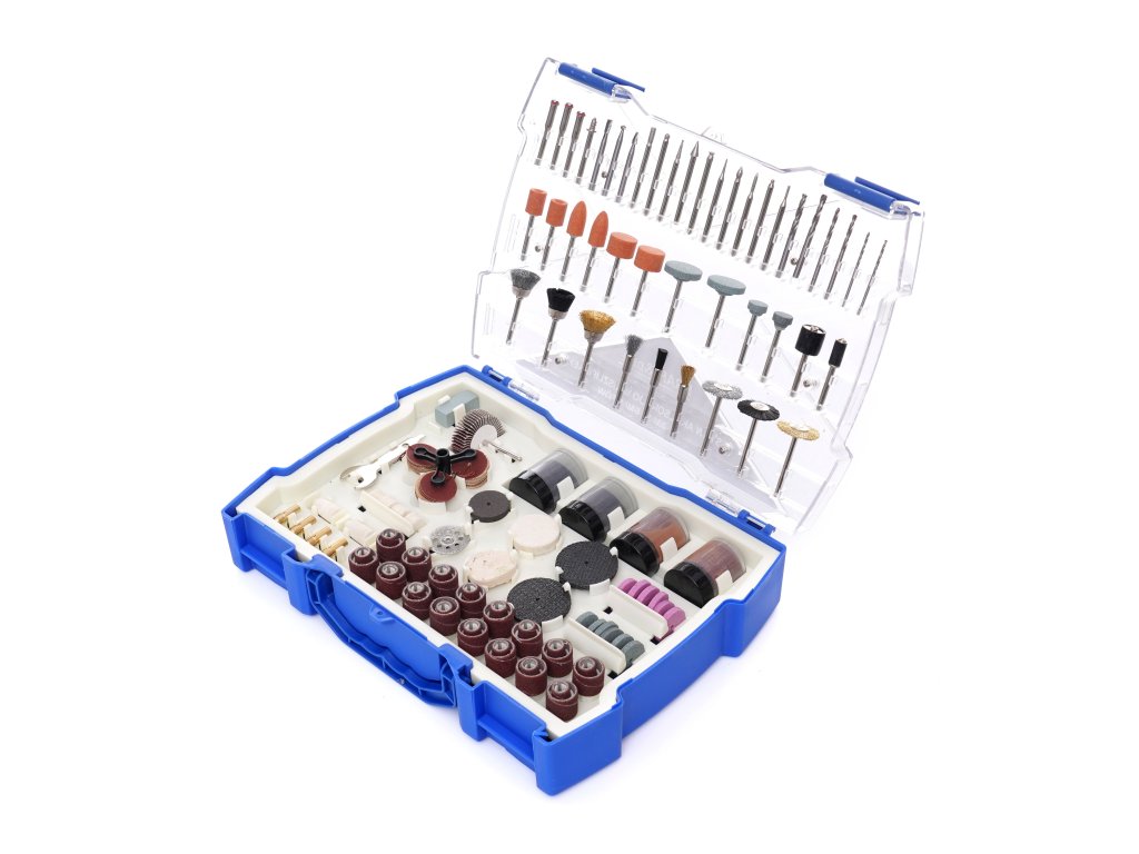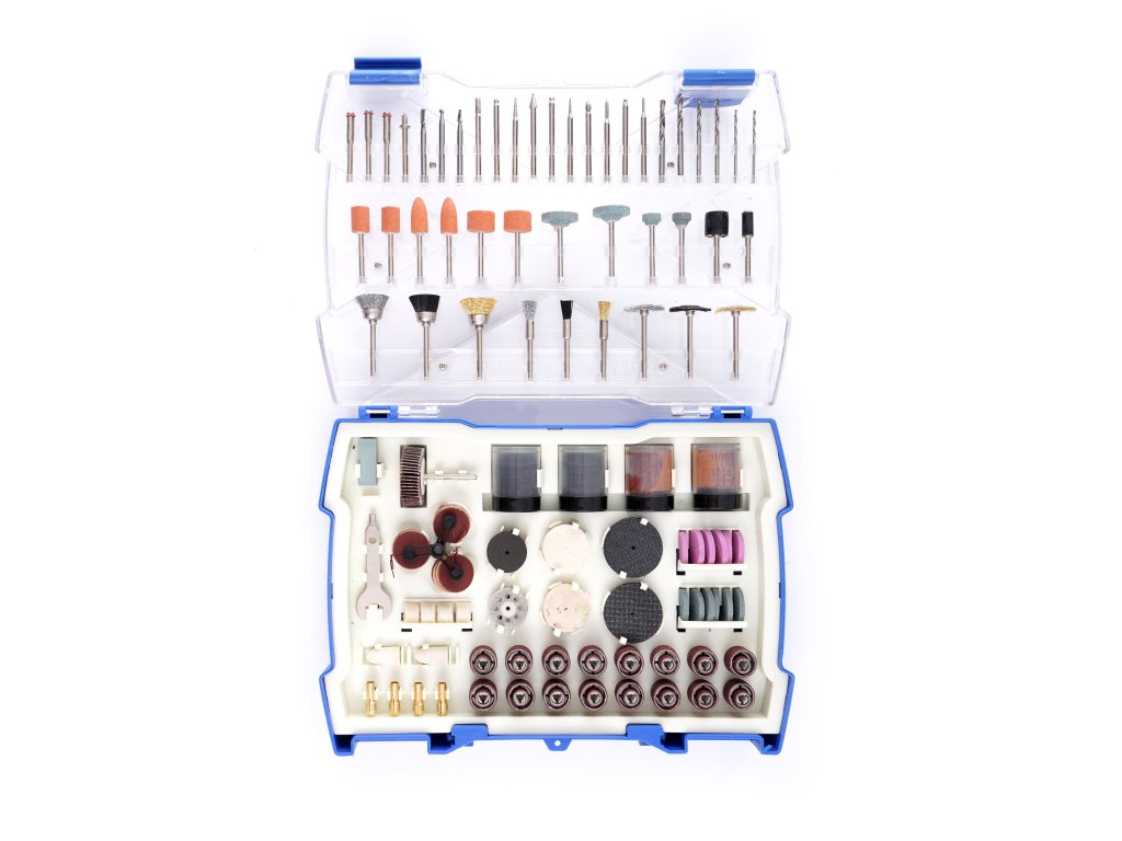 Set universal de accesorii pentru mini-polizor este o colecție care include 239 piese de echipamente variate.