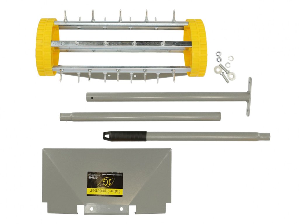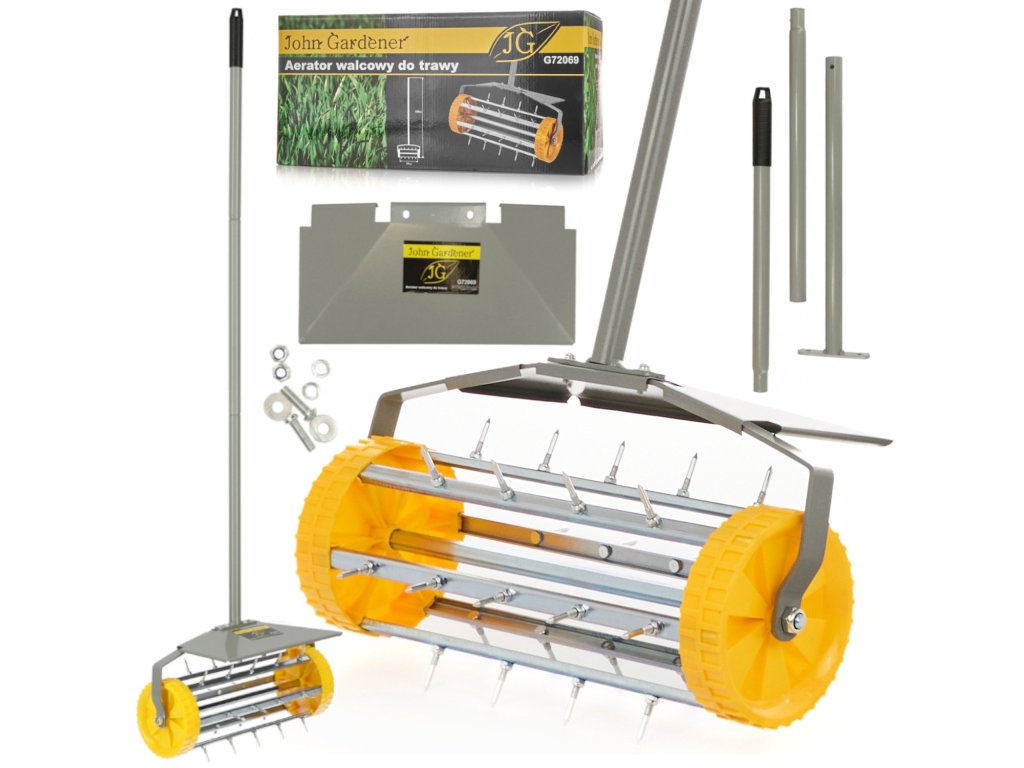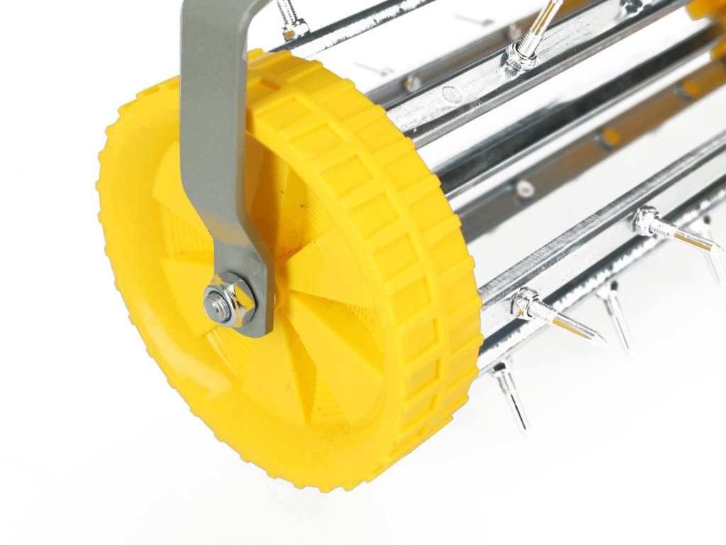 Aeratorul este compus dintr-un cilindru cu țepi dispuși regulat, roți de ghidare, un capac de protecție și un mâner pliabil în 3 părți, care asigură o manipulare și depozitare ușoară.