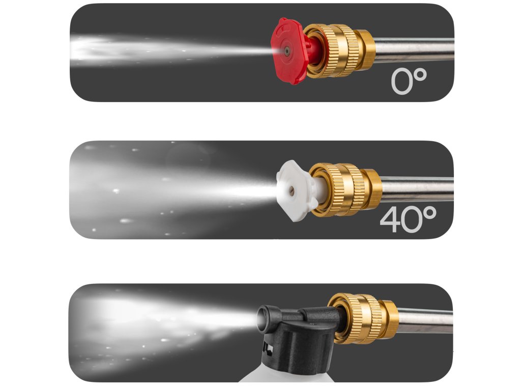 Generatorul de spumă inclus vă permite să aplicați cu ușurință agentul de curățare pe suprafață. Spuma groasă dizolvă murdăria și grăsimea, ceea ce facilitează foarte mult clătirea ulterioară și vă permite să obțineți un efect de curățare mai bun , de exemplu la spălarea mașinii.