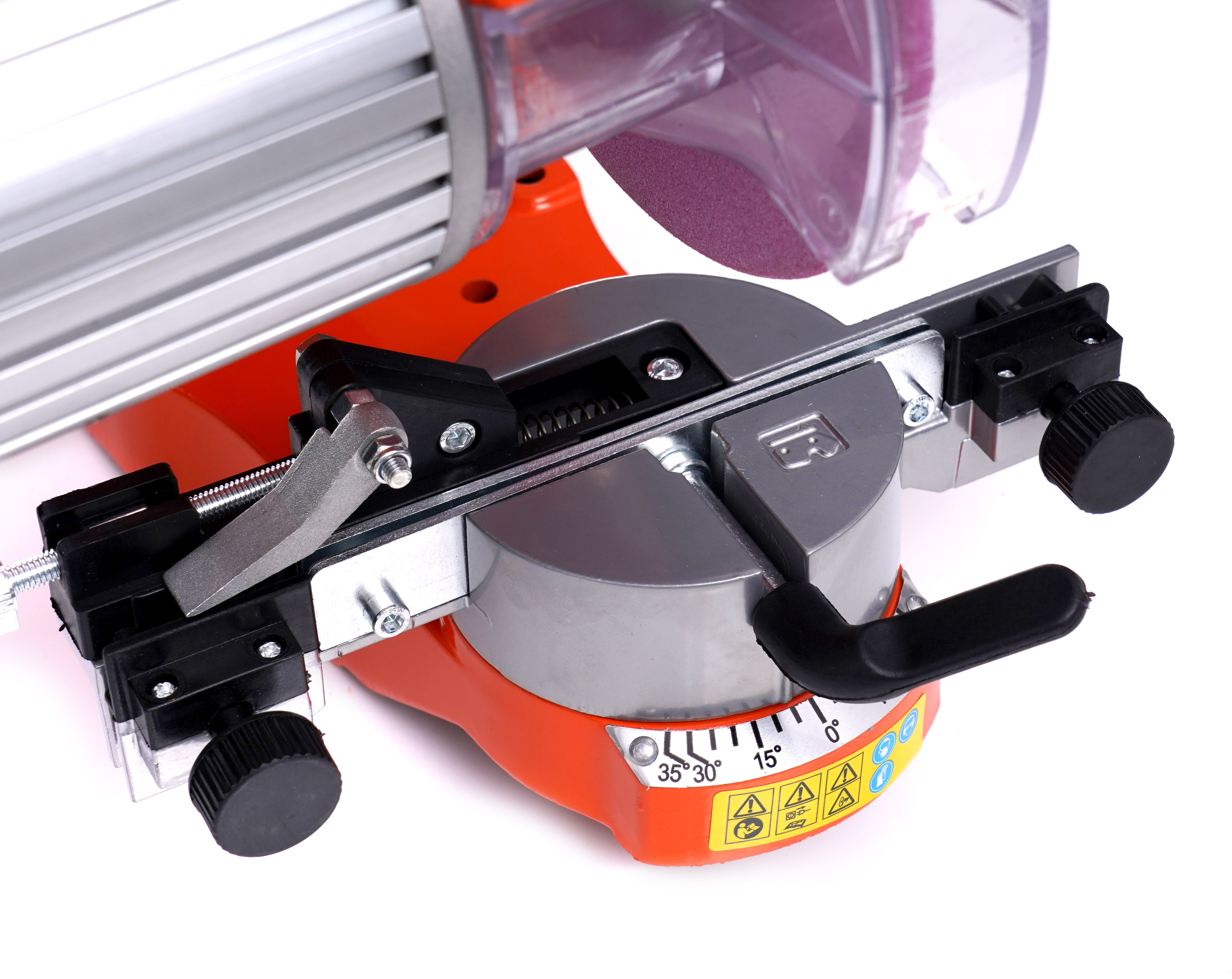 Dispozitivul este echipat cu un clemă înclinabilă, care permite ascuirea lanțului fără a fi necesară schimbarea locului de prindere, ceea ce asigură confort și siguranță în lucru.