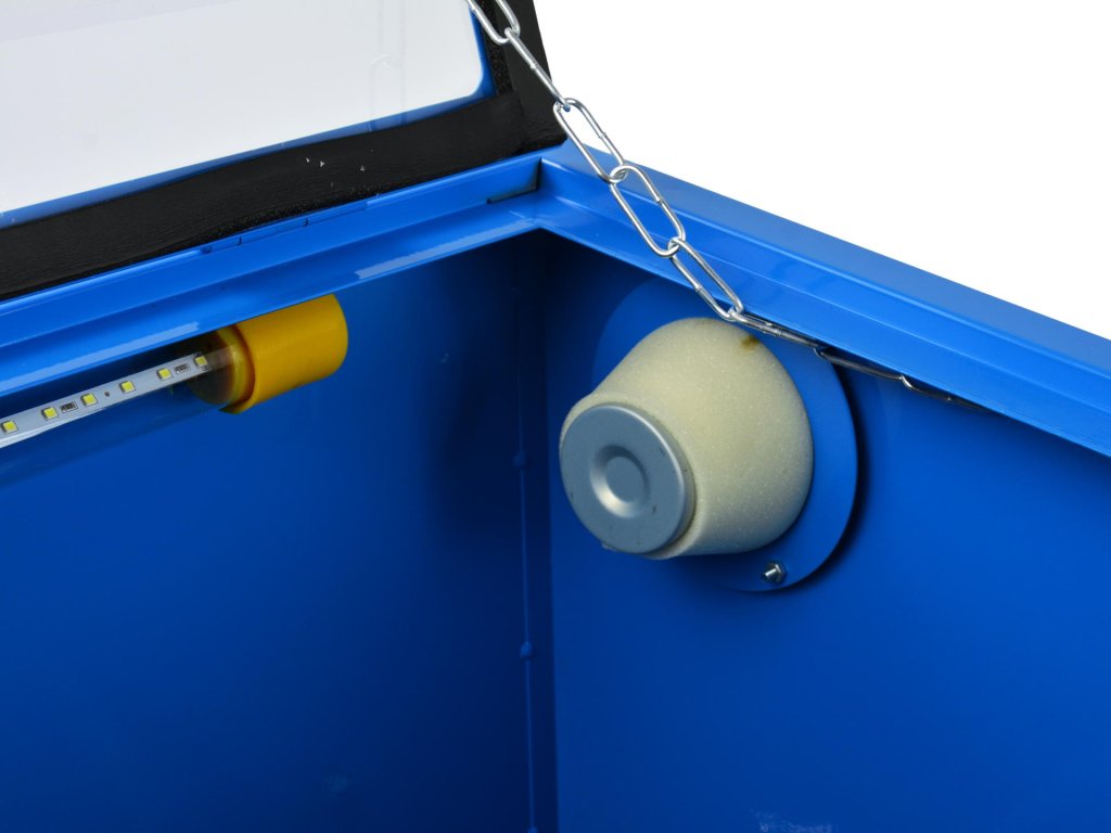 Cabină de sablare cu un volum de 90 litri este proiectată pentru a lucra într-un circuit închis de abraziv, ceea ce o face ideală pentru sablarea obiectelor mici. Acest echipament oferă o cameră robustă, echipată cu un capac rabatabil, pistol de sablare, patru duze ceramice, mănuși de lucru de înaltă calitate, iluminare a spațiului de lucru și o fereastră mare de vizualizare.