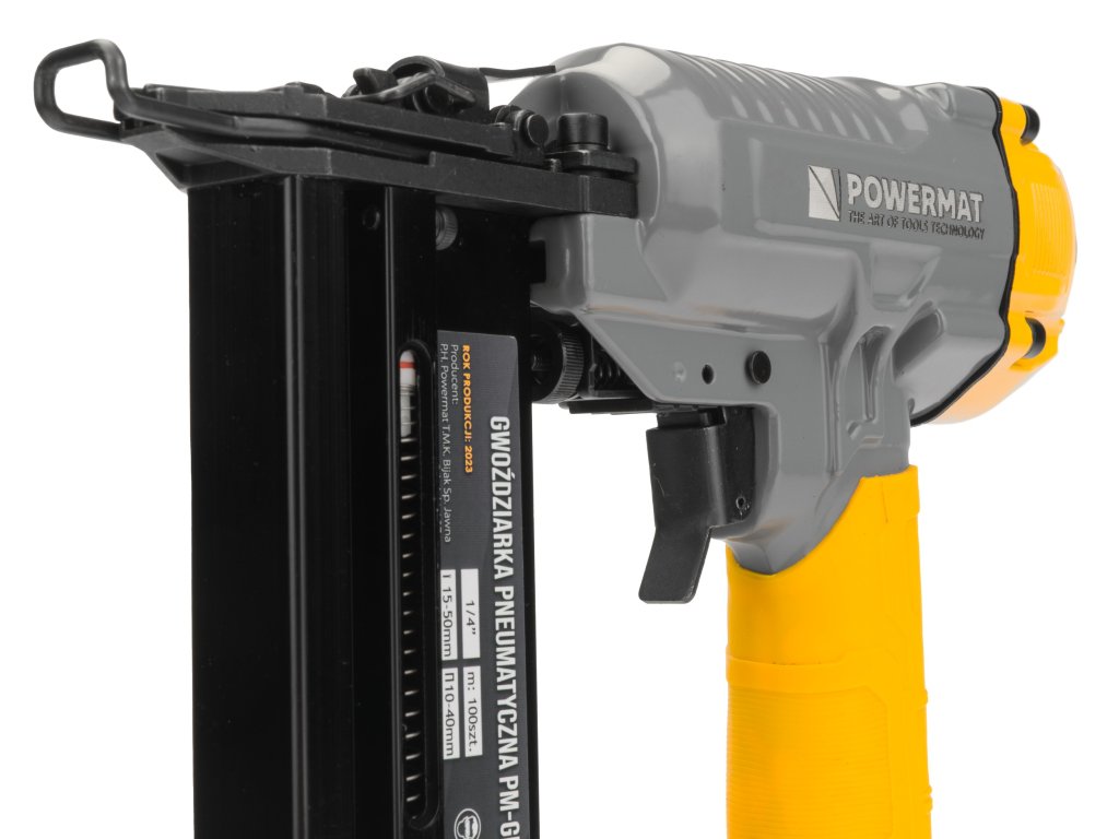 Mânerul cu înveliș de cauciuc antiderapant și greutatea redusă contribuie la valoarea practică ridicată a capsatorului și ciocanului POWERMAT. În opritor există un vizor care permite controlul stării magaziei și evaluarea cu exactitate a numărului de cuie sau capse.