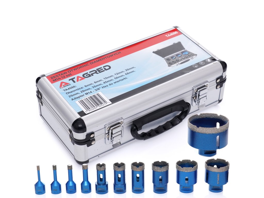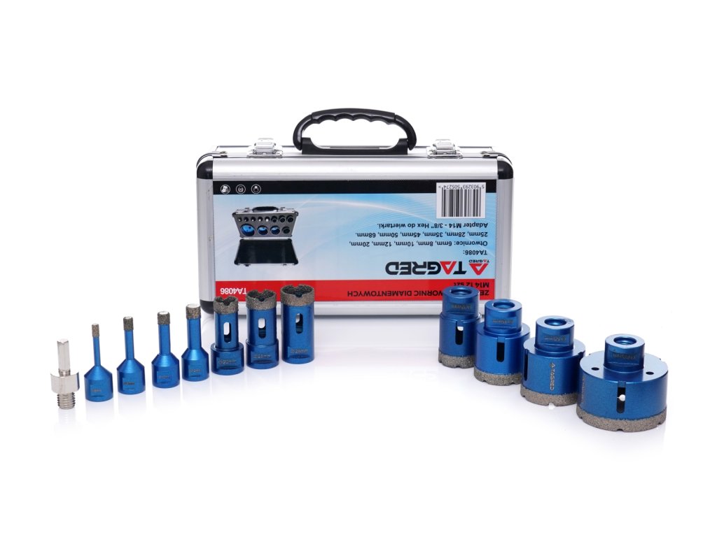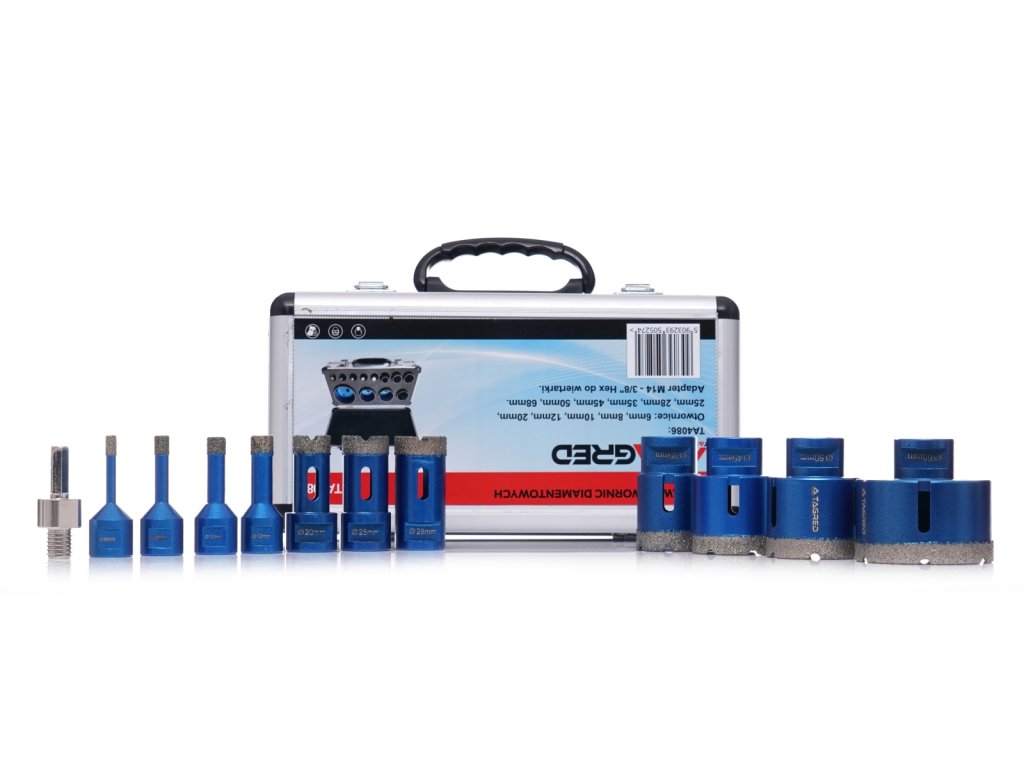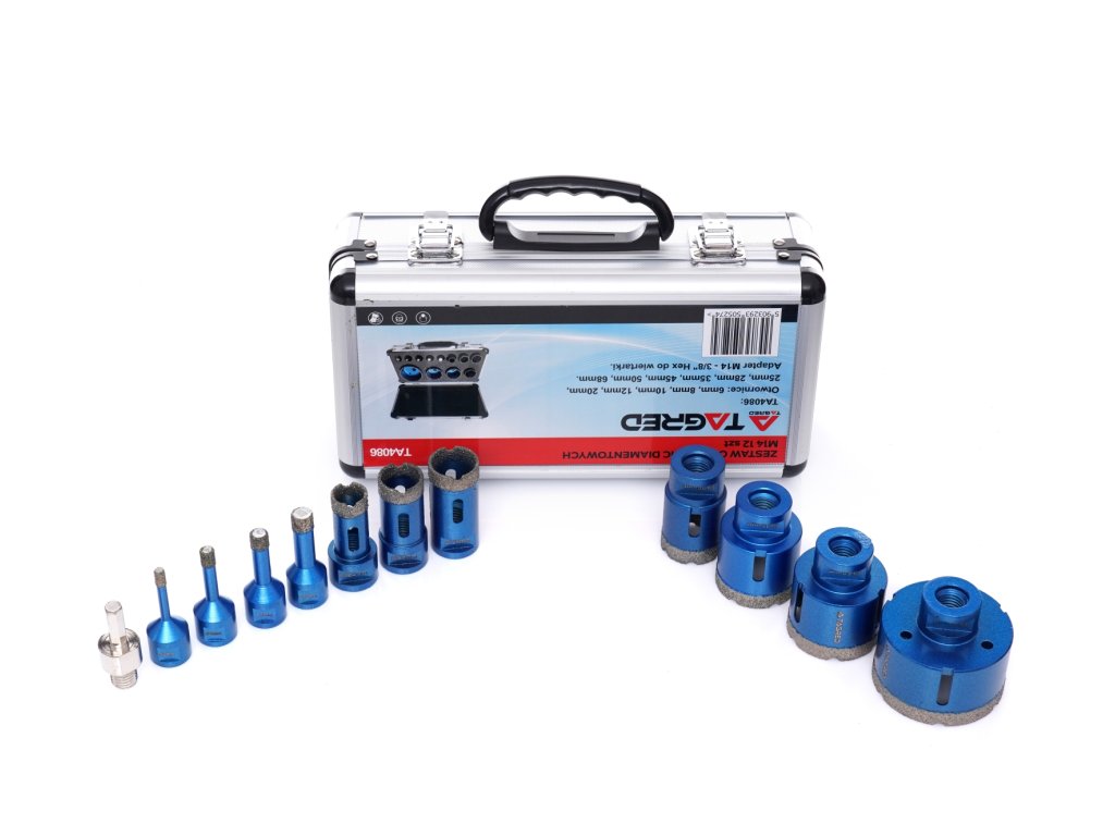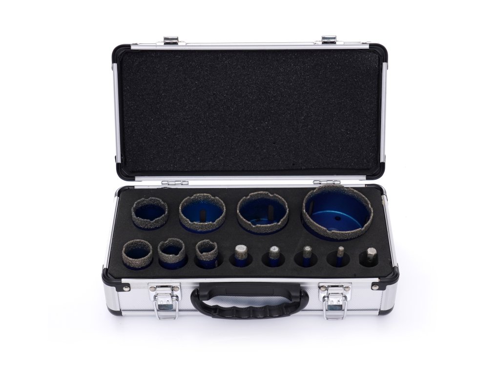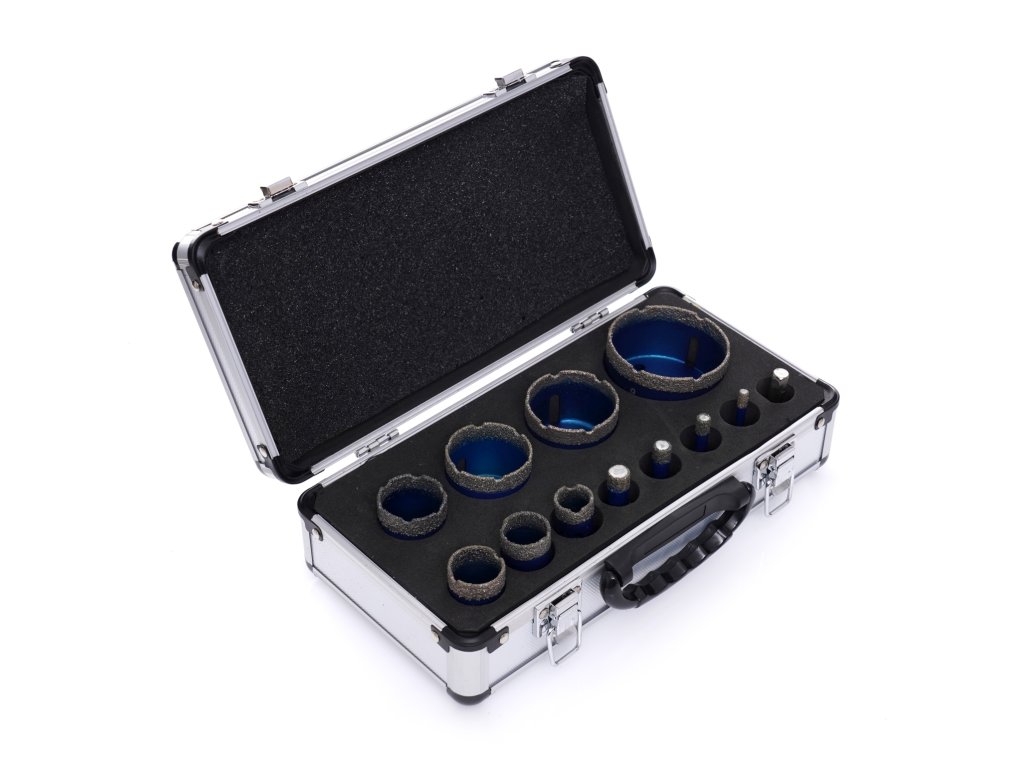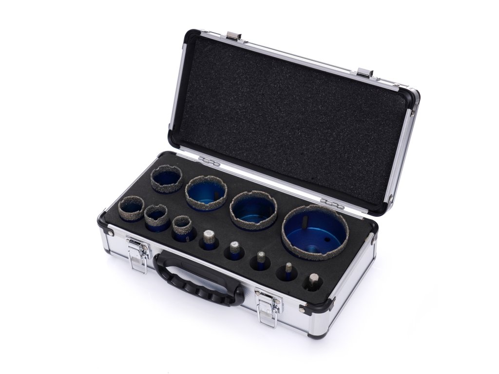 Carote diamantate pentru ceramică, piatră, gresie, faianță 6, 8, 10, 12, 20, 25, 28, 35, 45, 50, 68mm M14, trusă, adaptor, set 12 buc.