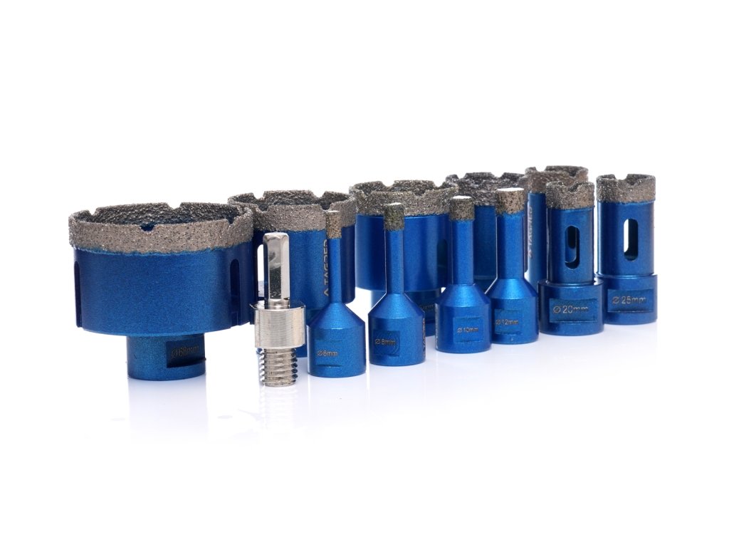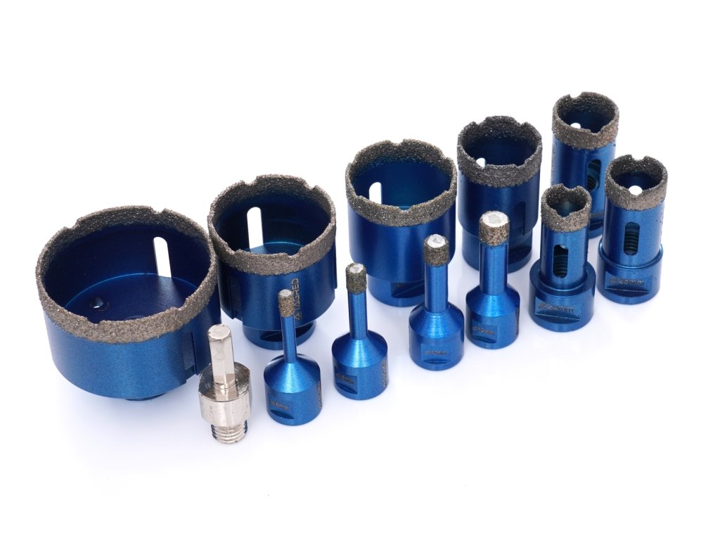 - Burghie diamantate pentru piatră și gresie: 6, 8, 10, 12, 20, 25, 28, 35, 45, 50 și 68 mm
