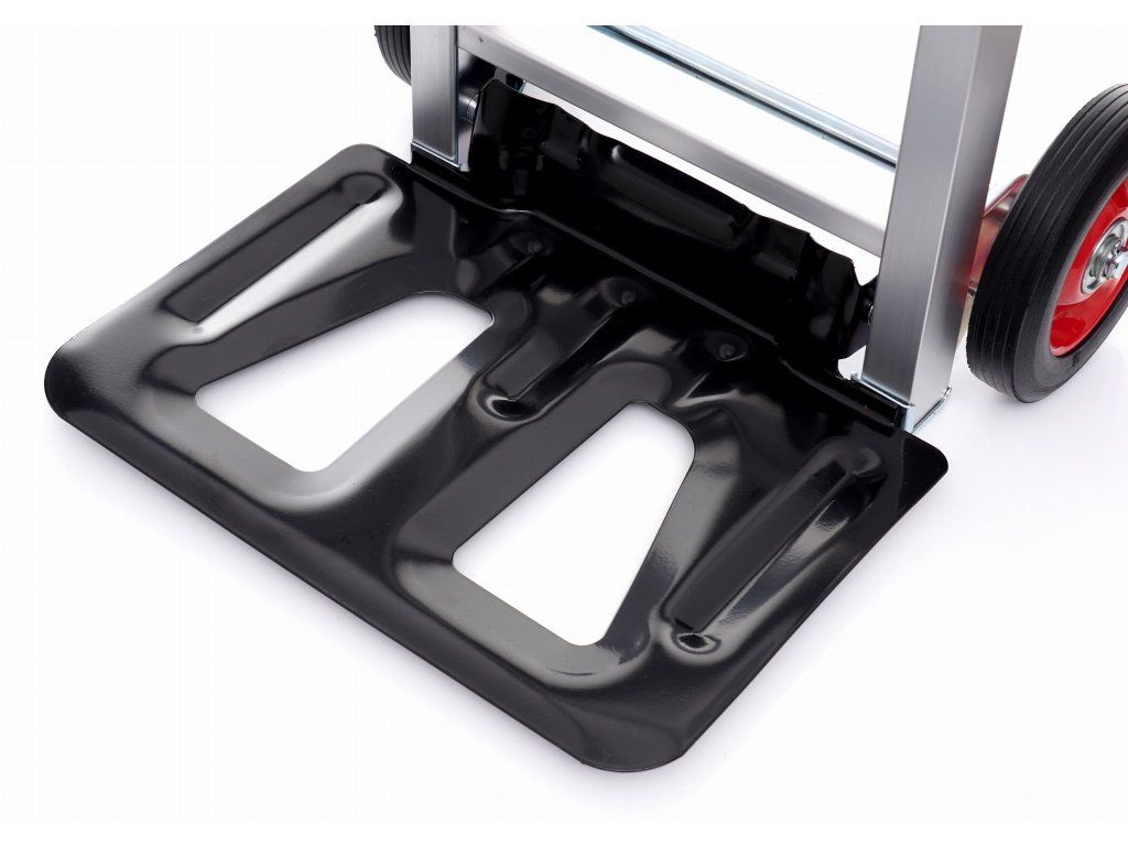 Căruciorul este echipat cu roți din cauciuc cu diametrul 150 mm, care asigură o călătorie stabilă și aderență ridicată pe diferite suprafețe. Platforma este întărită cu suporturi suplimentare, care întăresc construcția.