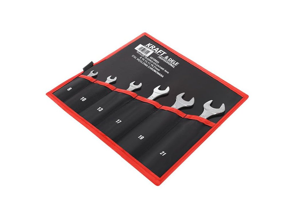 Setul conține chei plate și chei inelare în dimensiunile: 8, 10, 13, 17, 19, 21 mm