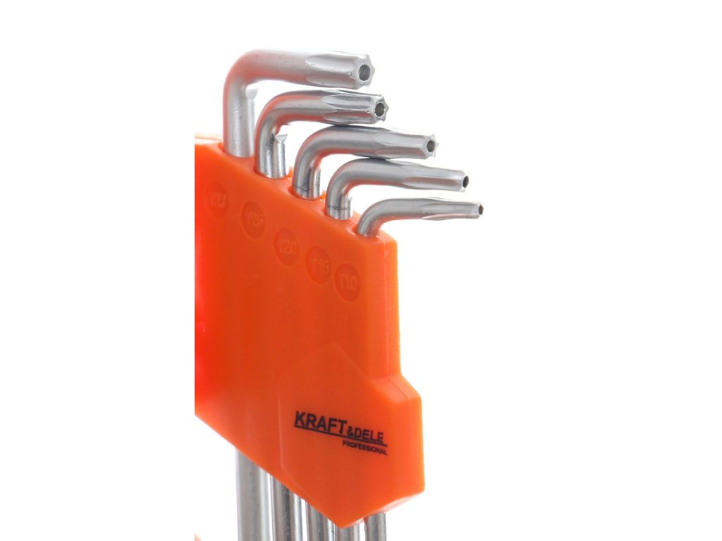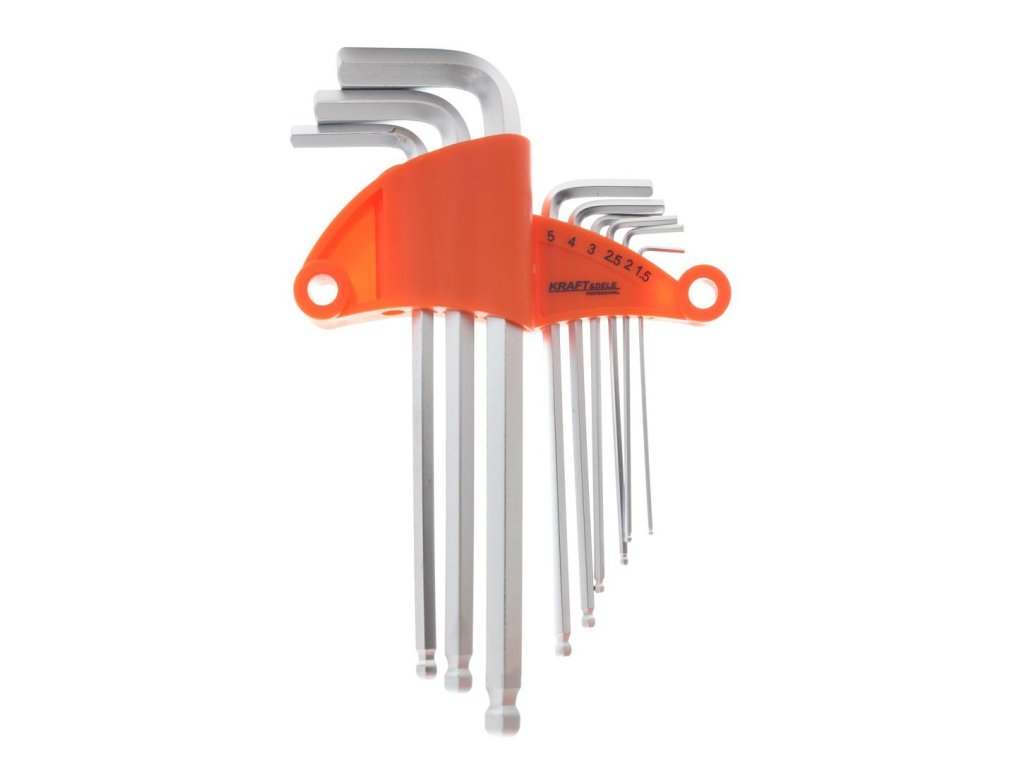 Set de 18 chei imbus rotunde și Torx KD10297. Sada de chei imbus rotunde cu cap sferic, marca KRAFT&DELE. Cheile imbus sunt fabricate din oțel crom-vanadiu CrV de înaltă calitate, cunoscut pentru rezistență și flexibilitate. Cheile sunt cu două capete.
