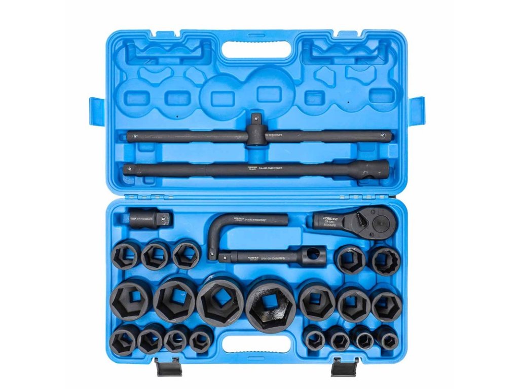 - Biți hexagonali de 3/4" - 17 bucăți: 17 mm, 19 mm, 21 mm, 22 mm, 24 mm, 27 mm, 30 mm, 32 mm, 33 mm, 34 mm, 35 mm, 36 mm (36 mm - 12 muchii), 38 mm, 41 mm, 46 mm, 50 mm