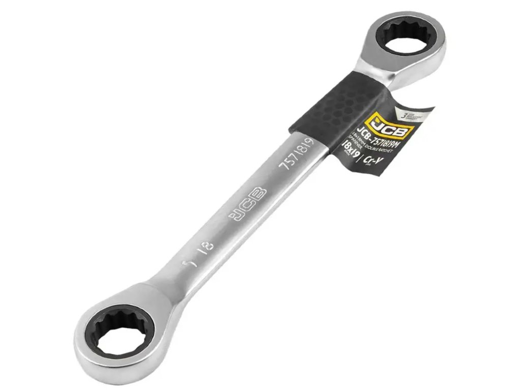 Cheie inelară cu două capete JCB cu clichet 18 × 19 mm, Cr‑V, 12 vârfuri