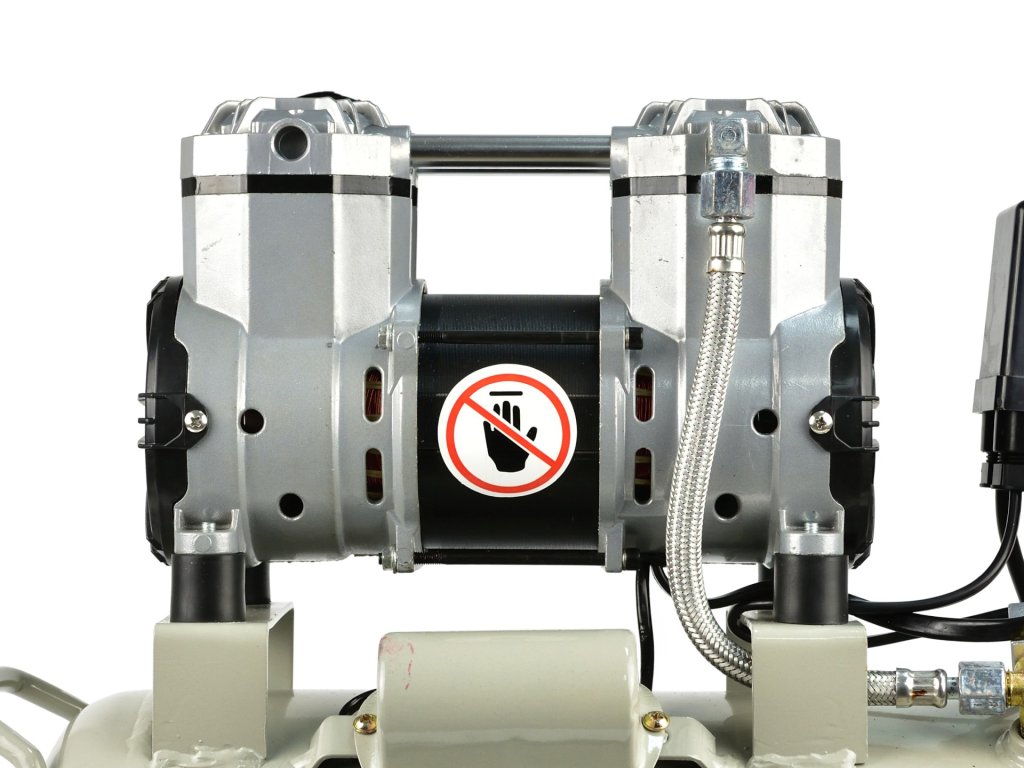 Compresorul este echipat cu o pompă fără întreținere, potrivită pentru utilizare pe termen lung și asigură o funcționare mai silențioasă comparativ cu compresoarele tradiționale pe ulei. În plus, este foarte mobil datorită roților, ceea ce facilitează considerabil mutarea acestuia.