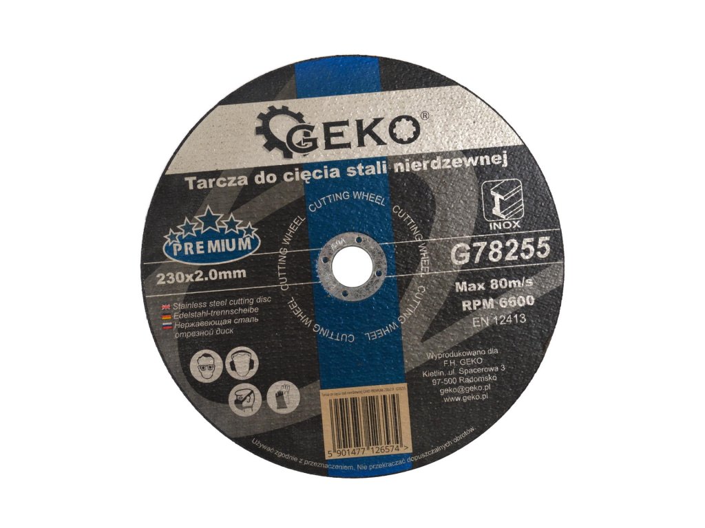 Disc de tăiere pentru oțel inoxidabil GEKO PREMIUM 230x2.0 G78255 este o alegere de calitate pentru tăierea oțelului inoxidabil. Acest disc conține abraziv legat cu rășină sintetică și este întărit cu țesătură din fibre de sticlă. Grăunțele abrazive din oxid de aluminiu asigură o eficiență ridicată în tăierea materialelor și prelungesc durata de viață a discului.