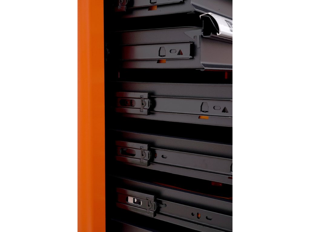Dulapul dispune de protecție împotriva furtului sub formă de lacăt central, care cu ajutorul a două chei încuie toate sertarele. Sertarele sunt echipate în plus cu blocări. Deși dulapul este greu, îl puteți muta cu ușurință oriunde datorită 4 roți pivotante cu frână și lacăt.