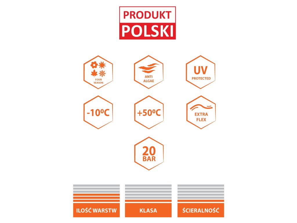 - Construcție în 3 straturi (miez negru, armătură încrucișată din fibră de poliester de calitate, înveliș transparent)