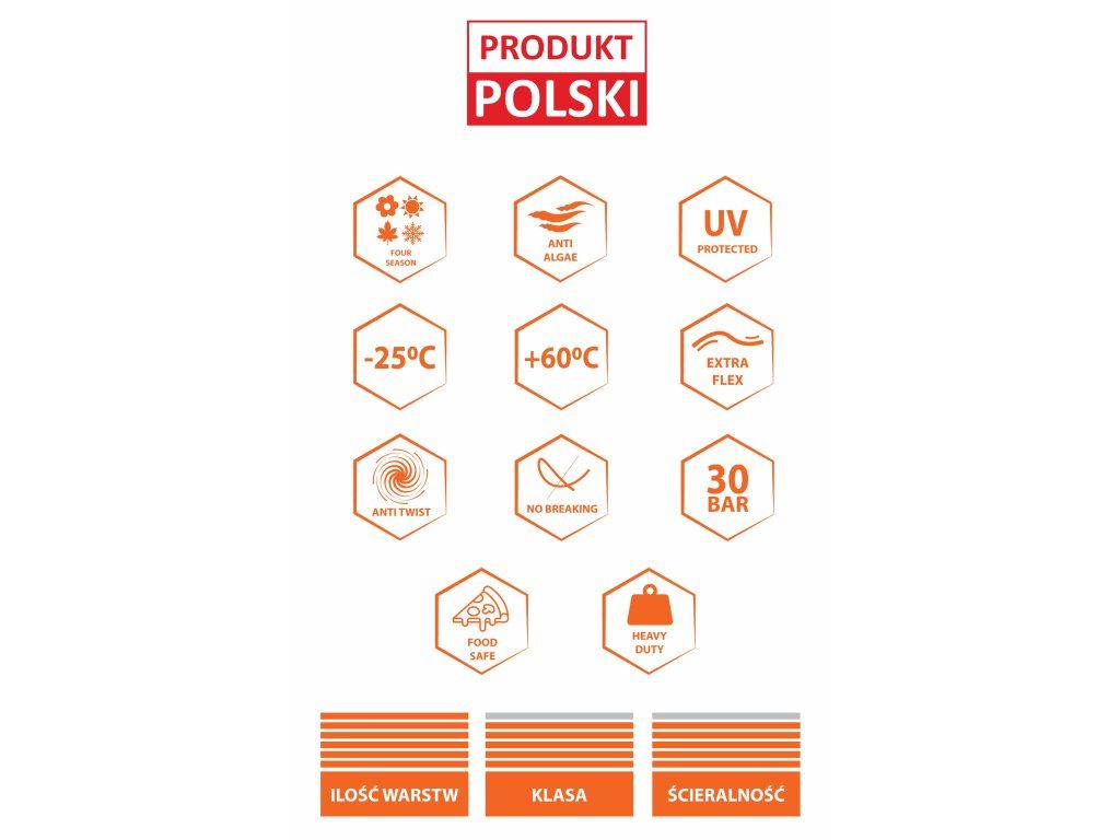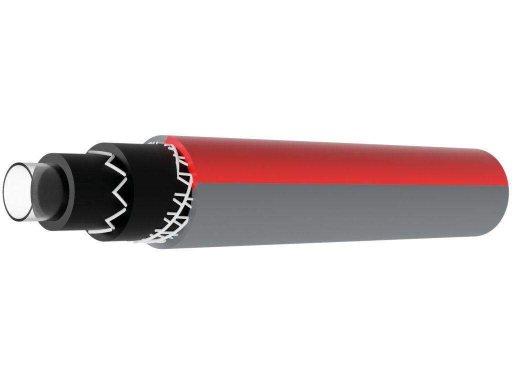 - Construcție cu 6 straturi: strat intern din materiale adecvate pentru contact alimentar, miez negru, împletitură transversală din fire de poliester de cea mai bună calitate, strat de acoperire