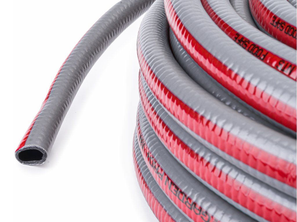 Furtunul este fabricat din material PVC de calitate, rezistent la radiațiile UV, cu o construcție împletită din fibre sintetice, strat exterior flexibil de PVC și un strat adecvat pentru contactul cu alimentele.