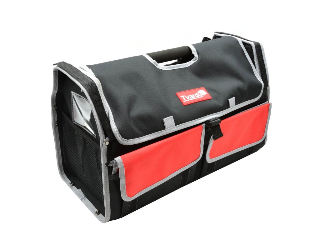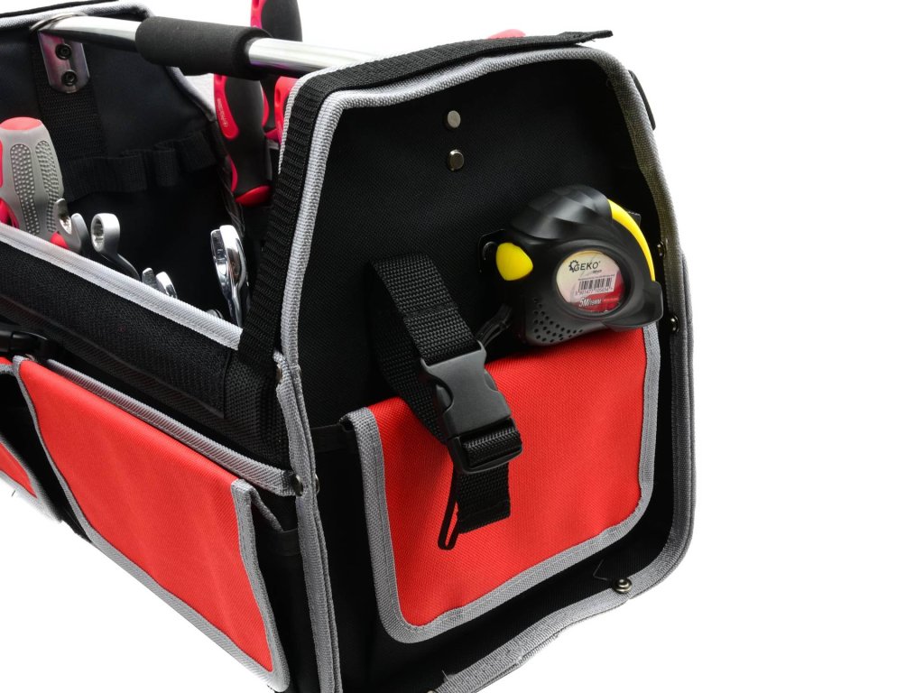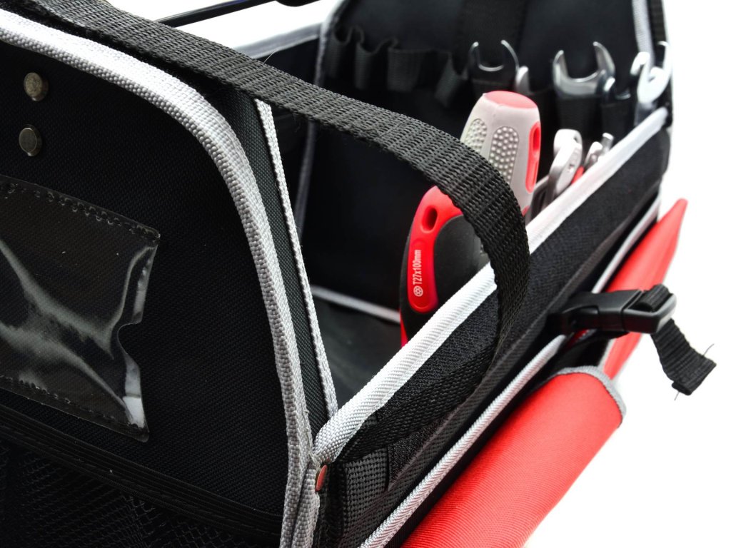 În partea de sus a genții se află două bucle elastice și două curele cu scai, permițând depozitarea sigură a uneltelor.