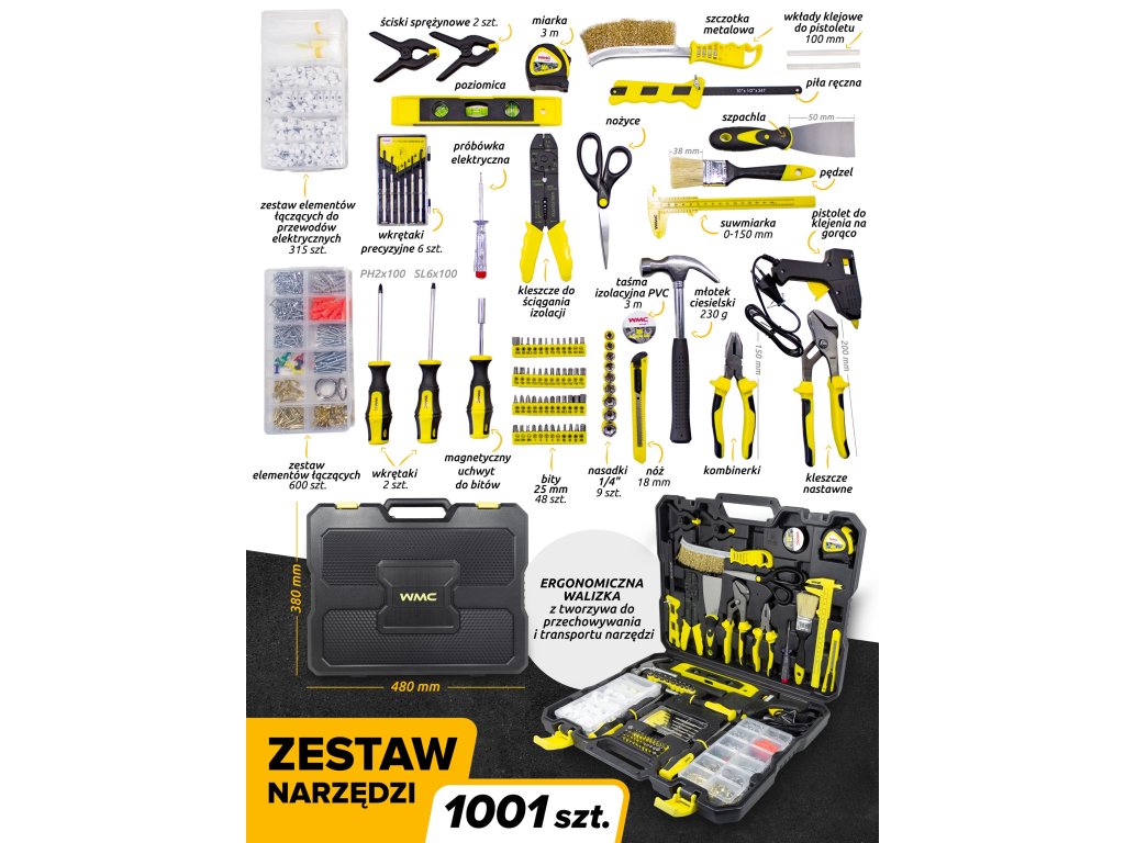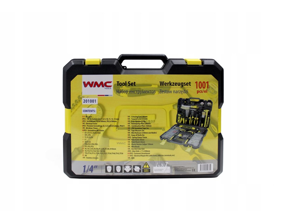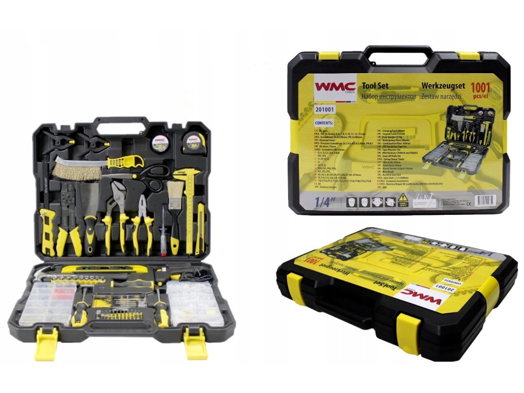 Idee grozavă de cadou! Set de scule WMC cu 1001 piese - chei, șurubelnițe, biți. Set universal complet pentru atelier acasă, mașină și uz profesional. Totul este depozitat cu grijă într-o cutie rigidă pentru transport și depozitare ușoară.