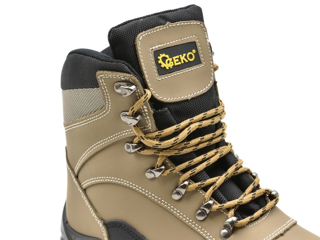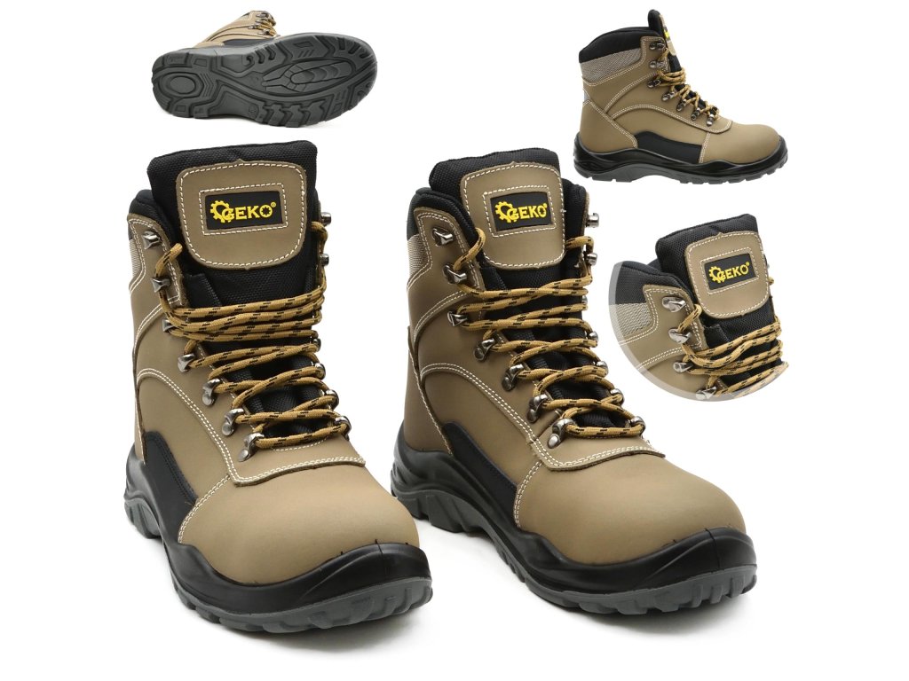Încălțăminte de lucru din piele funcțională PREMIUM de înaltă calitate, clasa S3. Încălțămintea de la renumita marcă GEKO este concepută pentru a proteja picioarele de influențele externe și pentru a oferi maximum de confort și siguranță la locul de muncă. Aceste încălțăminte respectă standardele CE EN ISO 20345:2011, care stabilesc cerințele pentru încălțămintea de protecție.