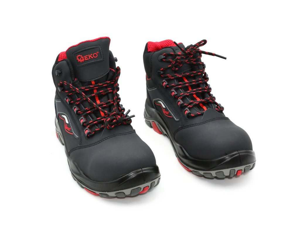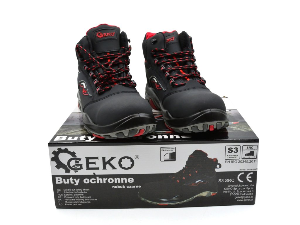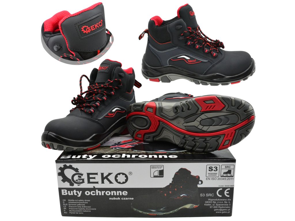 Încălțăminte profesională de lucru din piele PREMIUM de clasă S3 SRC de la renumitul brand GEKO, proiectată pentru a proteja picioarele de influențele externe, maximizând confortul și siguranța în muncă. Această încălțăminte îndeplinește standardele pentru încălțăminte de protecție: CE EN ISO 20345:2011.