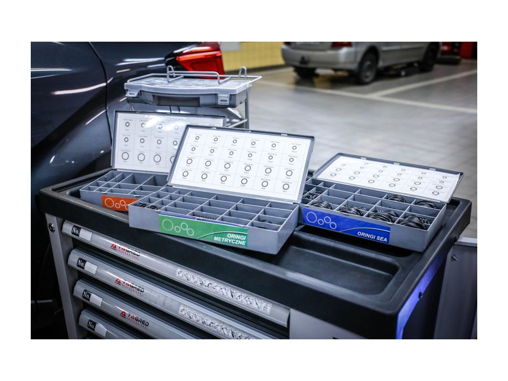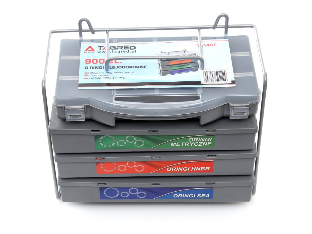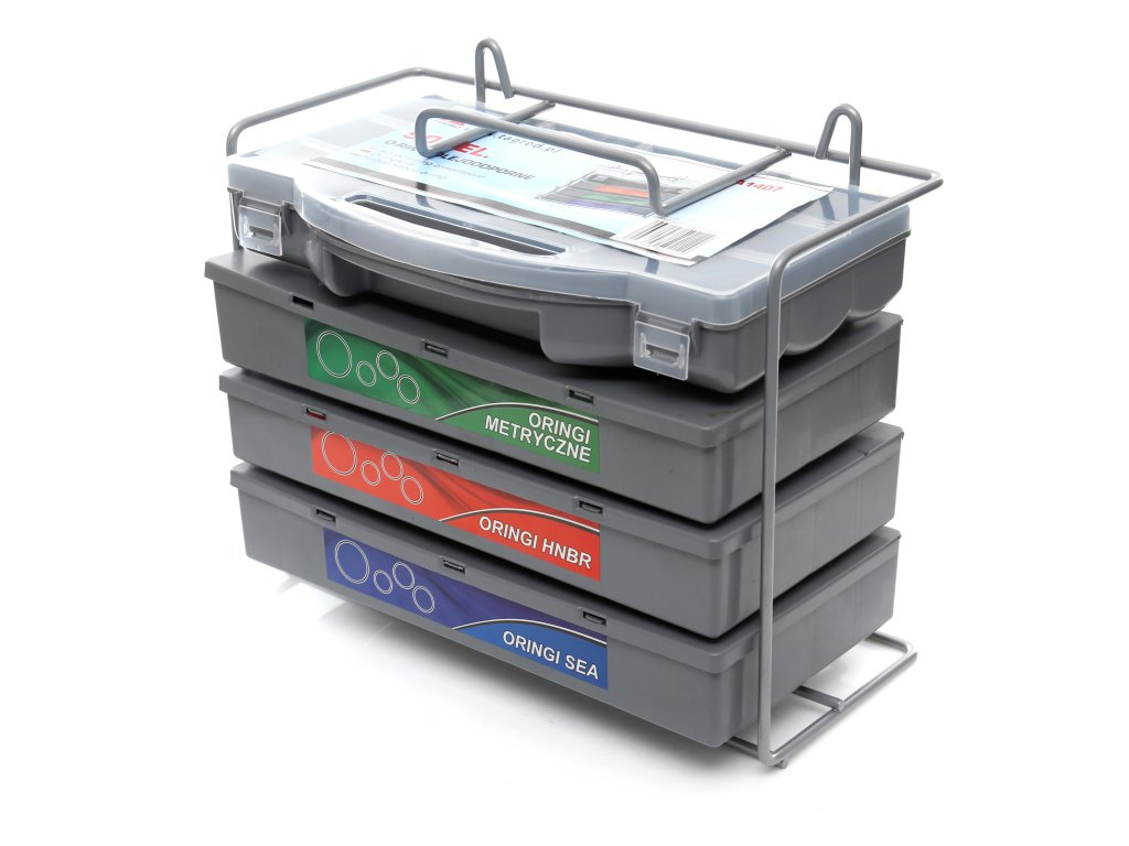 Inele O metabolice, HNBR, garnituri etanșare 900 buc, sortator este soluția ideală pentru oricine are nevoie de garnituri de calitate într-un singur set practic. Întregul set este ambalat și sortat în sertare foarte practice, facilitând găsirea rapidă a garniturii necesare. Sertarele sunt clar marcate, iar sortatorul este echipat cu un mâner și posibilitatea de montare pe un suport.