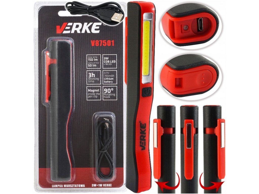 Lanterna LED cu baterie Li-ion incorporata si incarcator USB VERKE. Datorită utilizării tehnologiei LED COB (bandă de diode emitatoare de lumină), lanterna oferă mult mai multă lumină în comparație cu lanternele tradiționale și este, de asemenea, mult mai economică. Carcasa practică asigură că dispozitivul se potrivește ferm în mână. Capacitatea bateriei este de 700 mAh . Clema laterală rotativă cu magnet încorporat face lanterna foarte versatilă și convenabilă de utilizat.