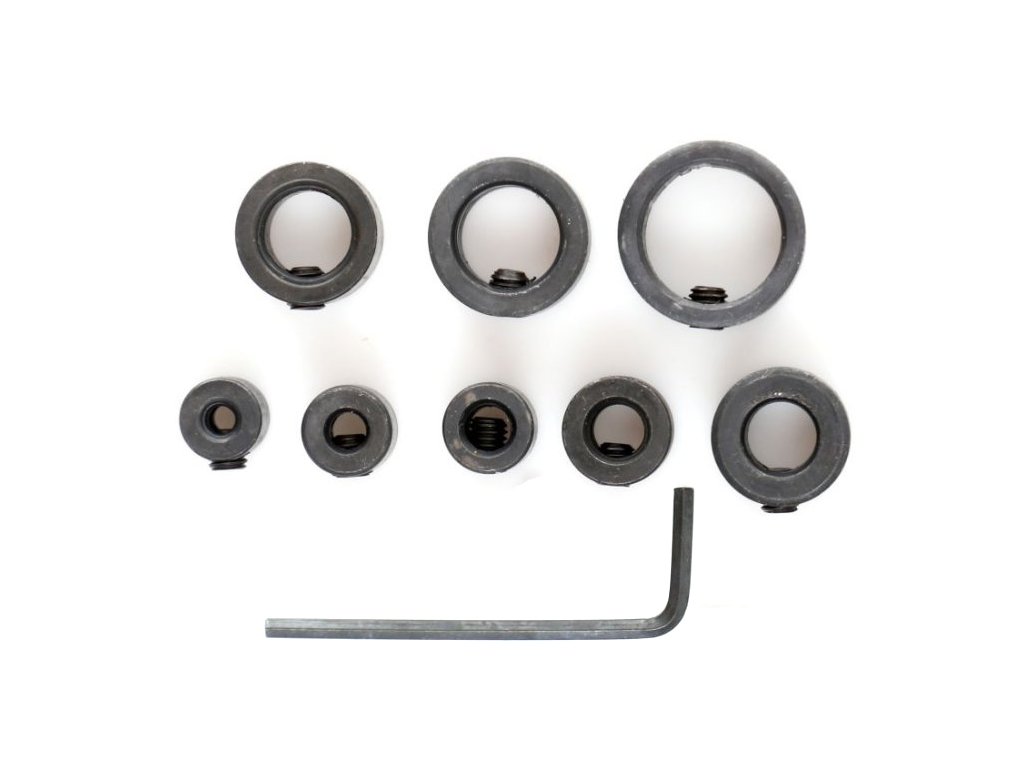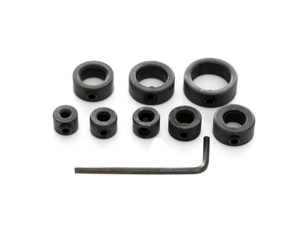 În pachet veți găsi 8 limitatoare, care sunt compatibile cu burghie de diametre 3, 4, 5, 6, 8, 10, 12 și 16 mm, împreună cu o cheie pentru strângerea șurubului de blocare.