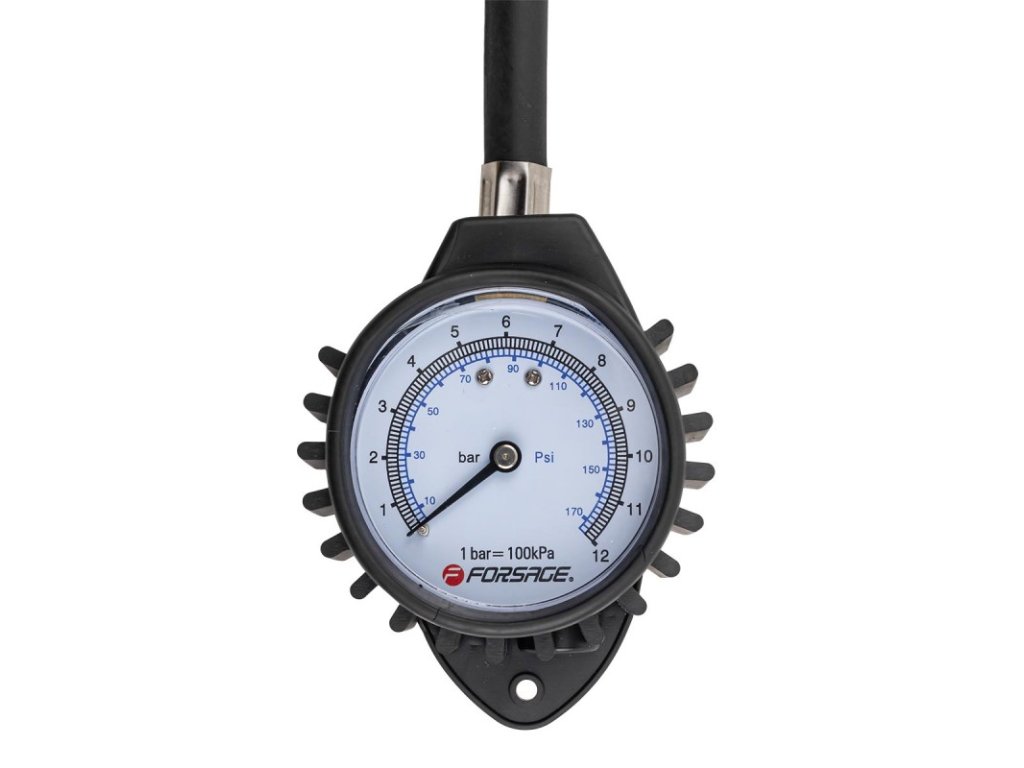 Manometrul pentru presiunea în anvelope are un interval de măsurare de la 0 la 12 bari, ceea ce permite măsurarea precisă a presiunii diferitelor tipuri de anvelope, de la anvelope de bicicletă la anvelope de mașină sau camion.