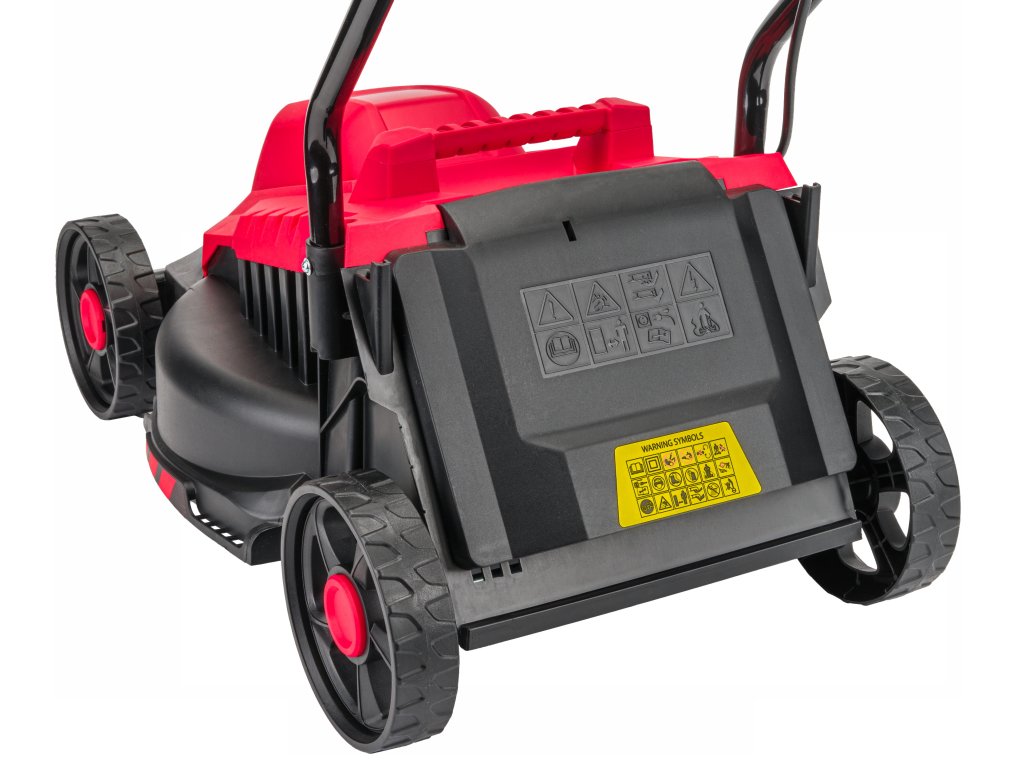 Pereți dubli ai carcasei cu armătură garantează reducerea posibilelor daune mecanice cauzate de pietre. Suprafața mare de tăiere de 32 cm sporește viteza de tăiere și este soluția ideală pentru grădinile mici și medii datorită dimensiunilor compacte și greutății reduse.