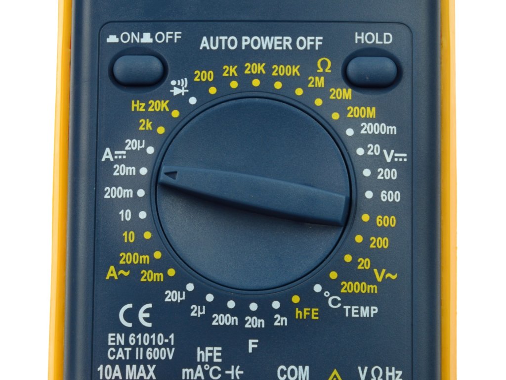 - Măsurători: Tensiune AC/DC, curent AC/DC, rezistență, frecvență, capacitate, temperatură, amplificare tranzistor (hFE)