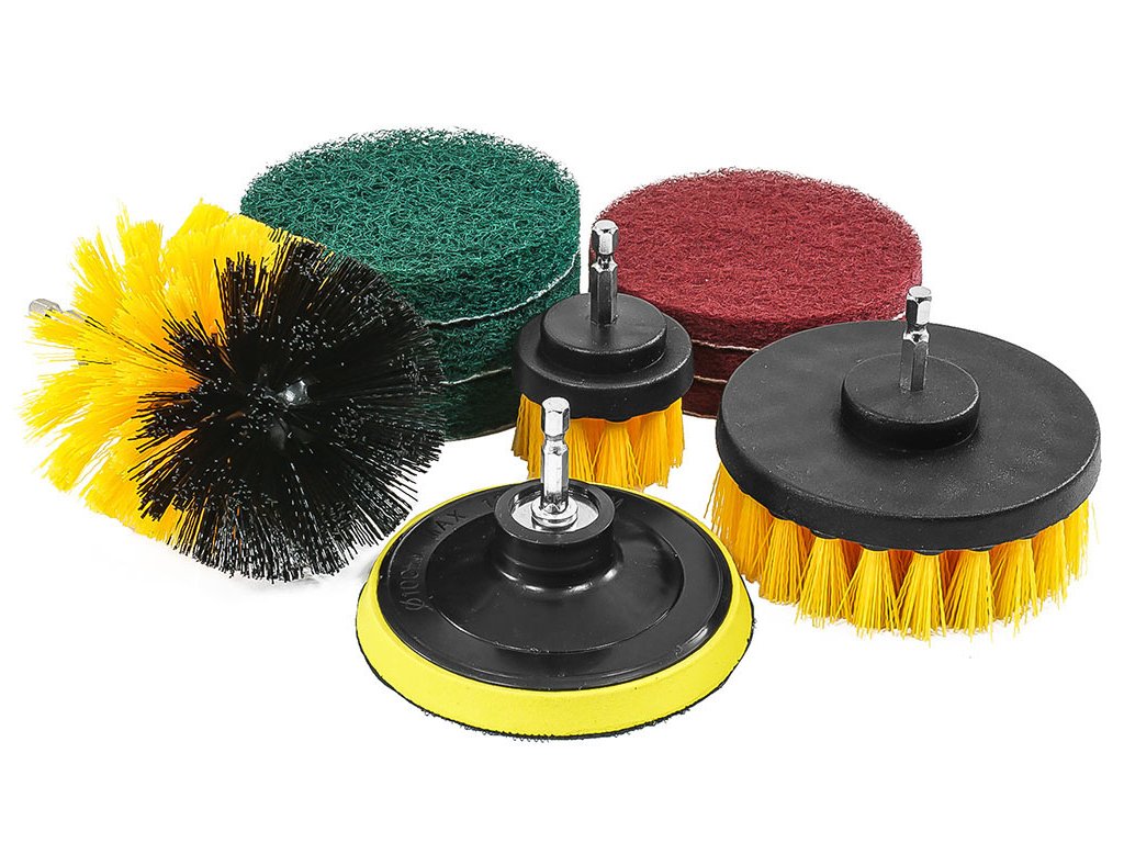 Set de perii de curățare și frecat de înaltă calitate. Setul include perii de diferite dimensiuni și rugozitate, permițându-vă să curățați temeinic nu numai suprafețe mari, ci și colțuri mici. Perii periei sunt fabricați din fibre de nailon care nu vor zgâria suprafața. În plus, sunt rezistente la funcționarea la viteze foarte mari .