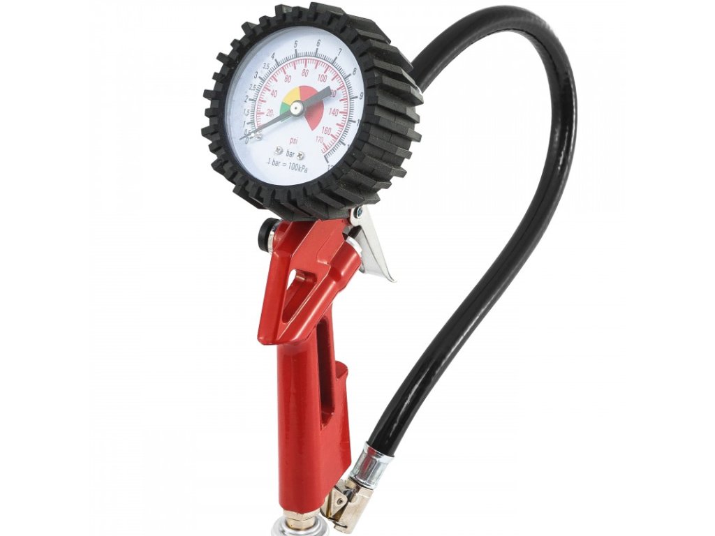 Un pistol de umflare a anvelopelor cu un manometru este utilizat pentru a umfla și a verifica presiunea în anvelope. Este echipat cu o carcasă de cauciuc pentru manometru care este rezistentă la șocuri. Pistolul este, de asemenea, echipat cu o supapă de eliberare a aerului.