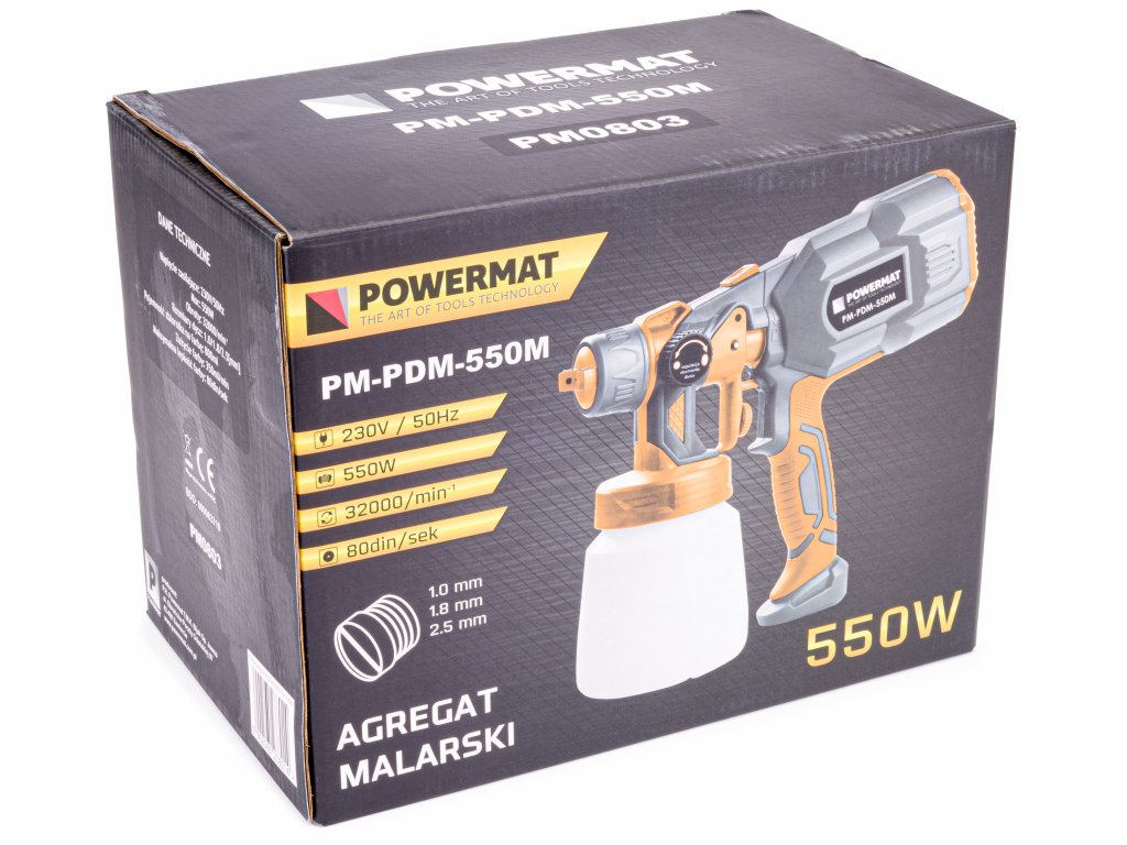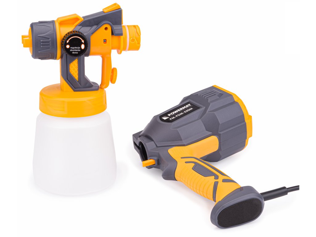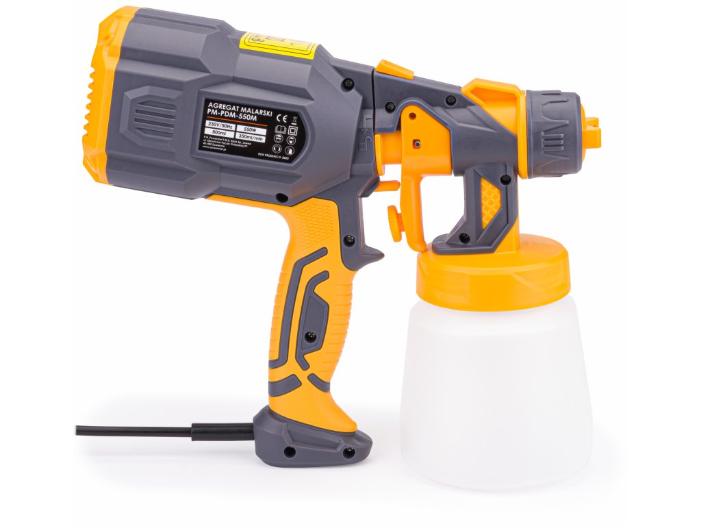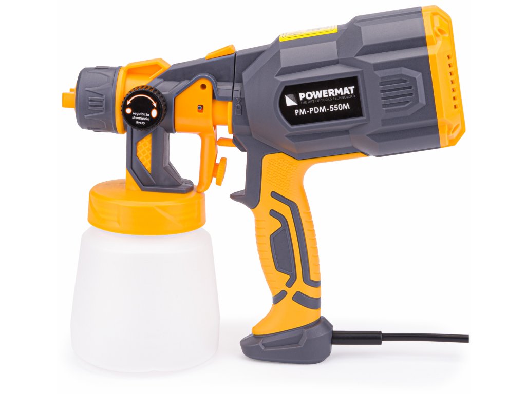 Pistolul de vopsit marca POWERMAT este echipat cu un motor durabil și puternic de 550 W, transformându-l într-o unealtă esențială pentru utilizarea casnică.