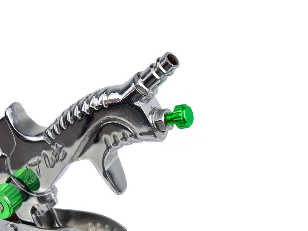 Butonul de reglare situat pe partea laterală a corpului pistolului permite reglarea dimensiunii jetului de vopsea. Butonul de setare a materialului permite reglarea cantității de vopsea pulverizată prin duză. Butonul de reglare a presiunii permite reglarea presiunii aerului care ajunge la pistol din compresor.