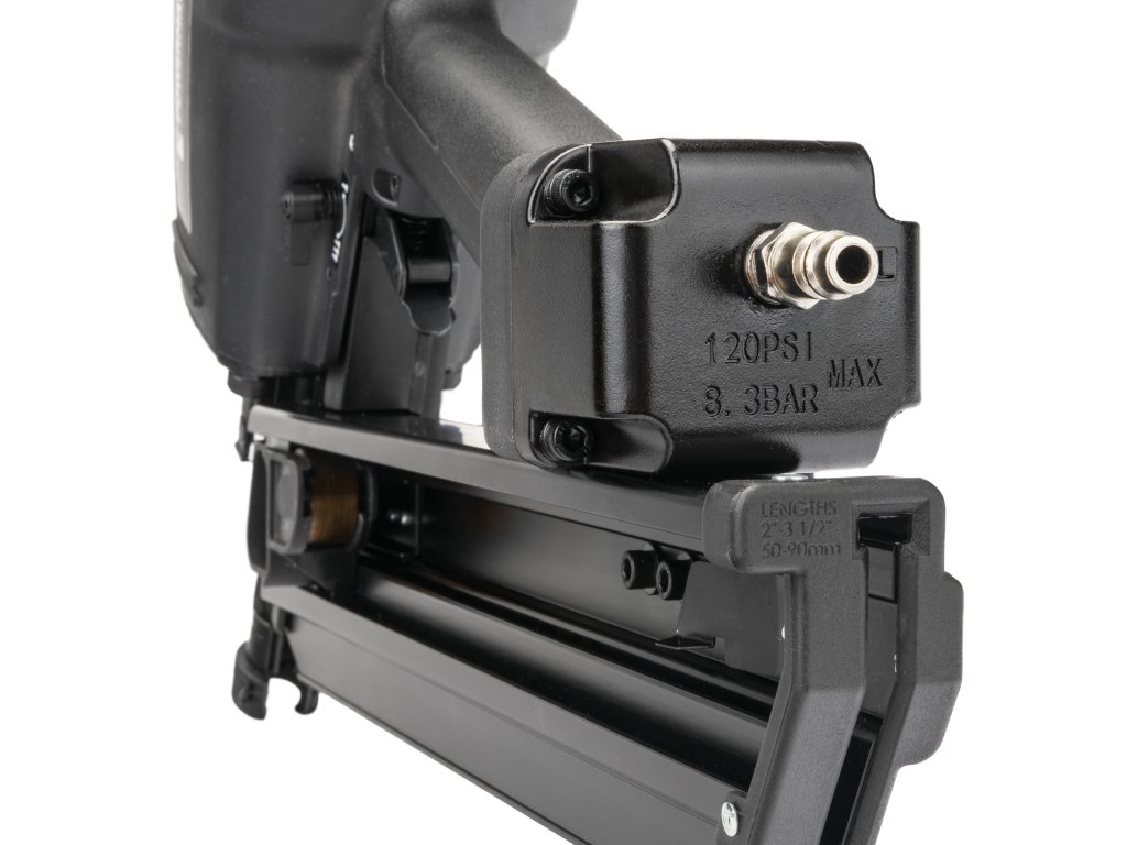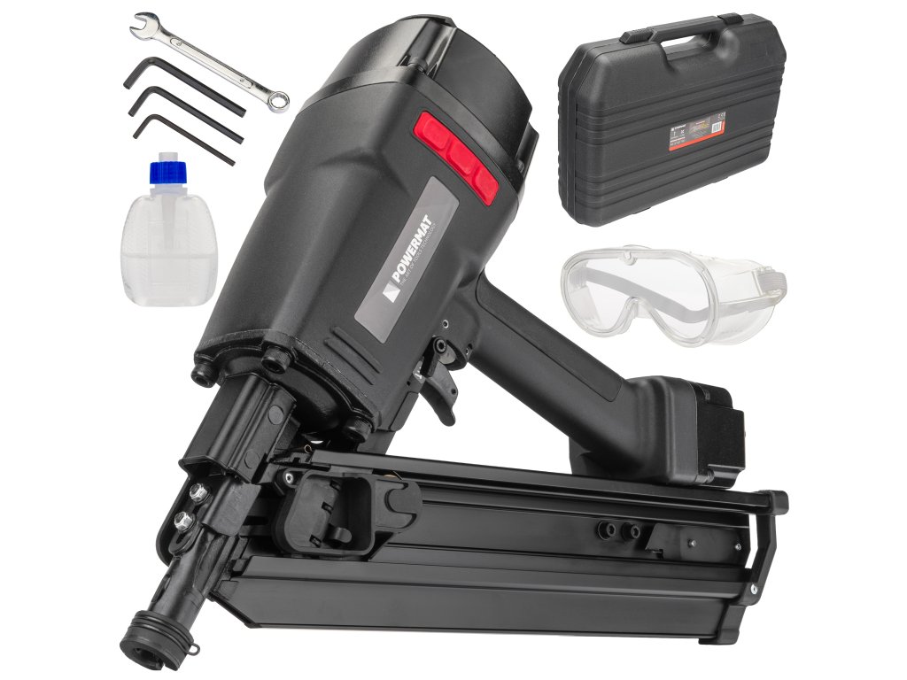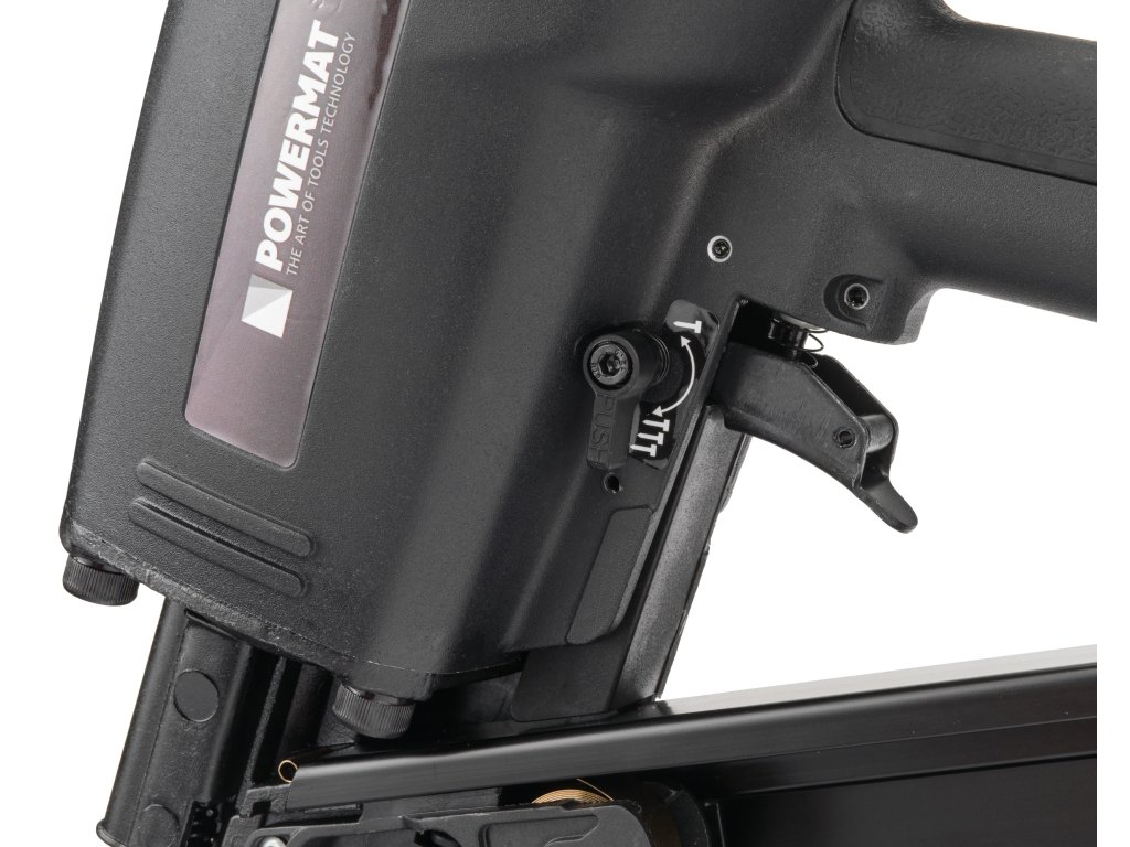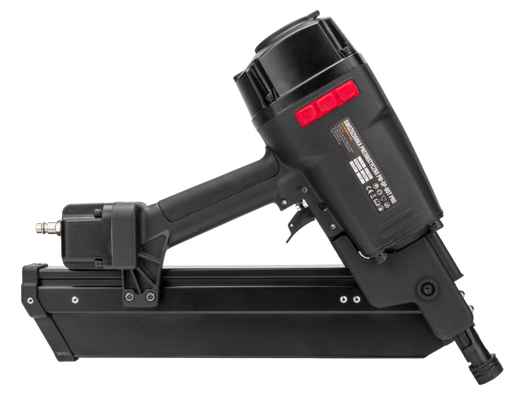 - Pistol pneumatic cu bandă PM-GP-80T PRO pentru cuie legate cu hârtie la un unghi de 34° și lungime între 55 și 90 mm, destinat aplicațiilor ușoare, uzului semiprofesional și hobby.