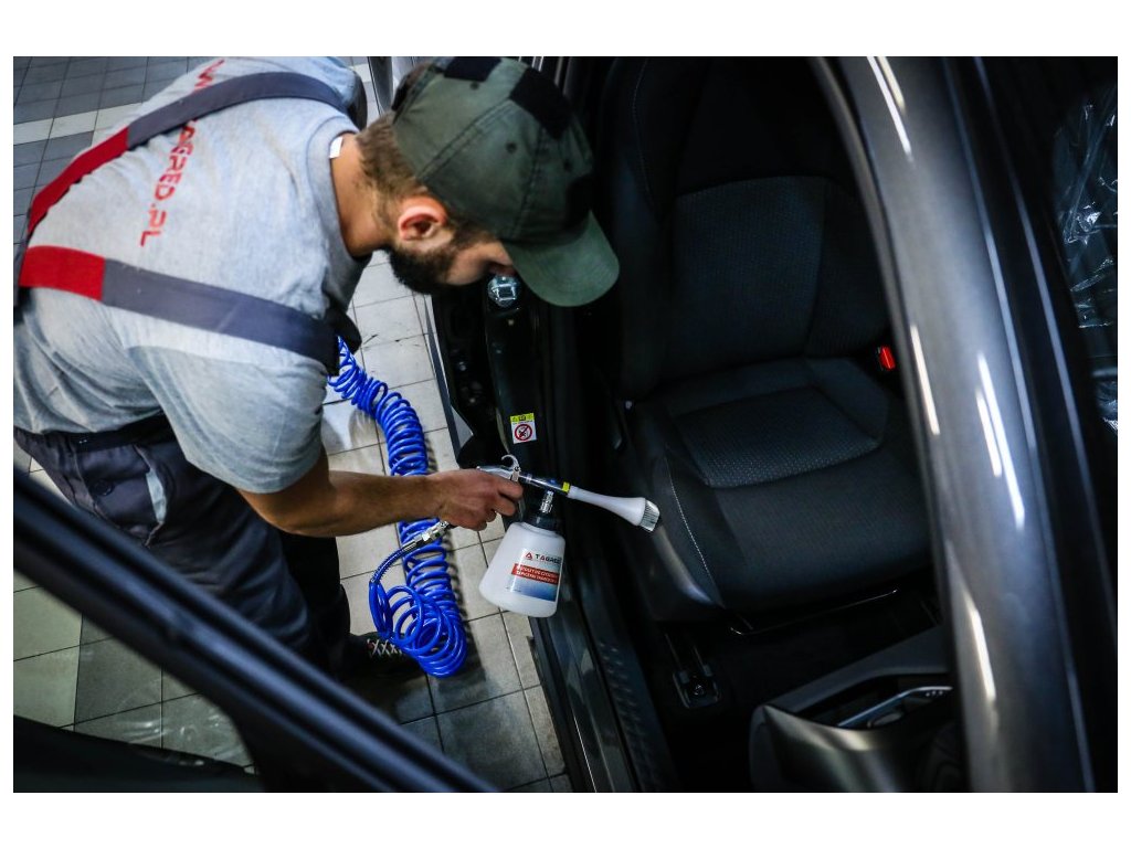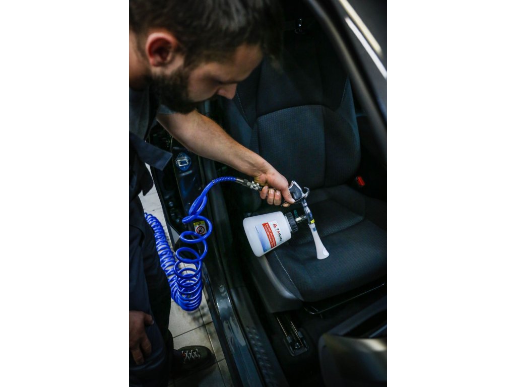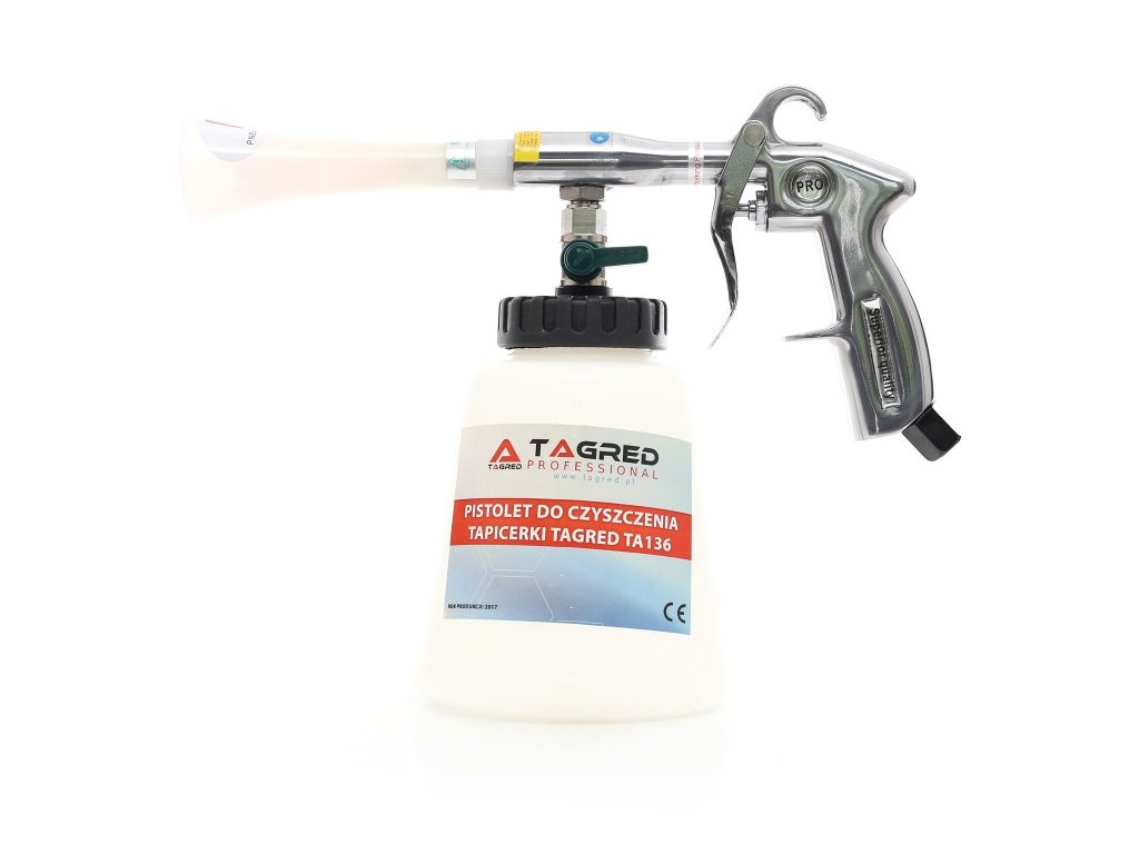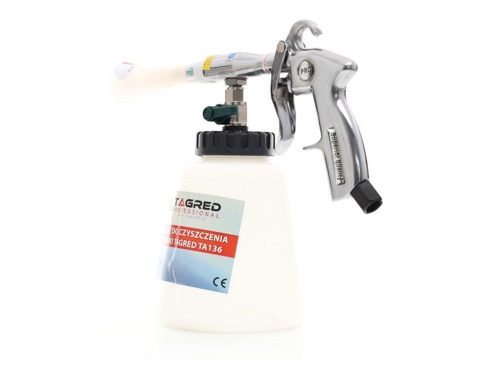 Datorită duzei special formate cu un miez rotativ, pistolul generează, sub presiunea aerului comprimat, o soluție de curățare spumoasă care curăță ușor toate suprafețele, umezindu-le doar ușor. Acest aparat foarte eficient consumă o cantitate minimă de apă și soluții de curățare, ajungând chiar și în locuri greu accesibile, cum ar fi rosturile, unde un burete obișnuit, cârpă, perie sau pensulă nu pot pătrunde. Este ideal pentru curățarea comercială a diverselor tipuri de suprafețe, cum ar fi tapițeria, mobilierul, jantele și gurile de aerisire.