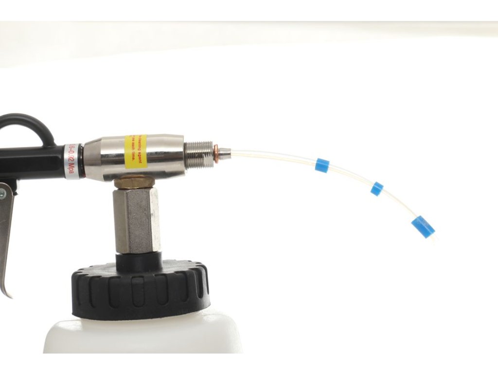 Pistolul de curățare este livrat cu un furtun pe care este montată o greutate, ceea ce facilitează foarte mult lucrul sub unghi și cu o cantitate mică de rezervă. Datorită utilizării greutății, rezerva din rezervor este utilizată eficient la minim. În greutate este, de asemenea, montat un filtru care previne blocarea pistolului de curățare.