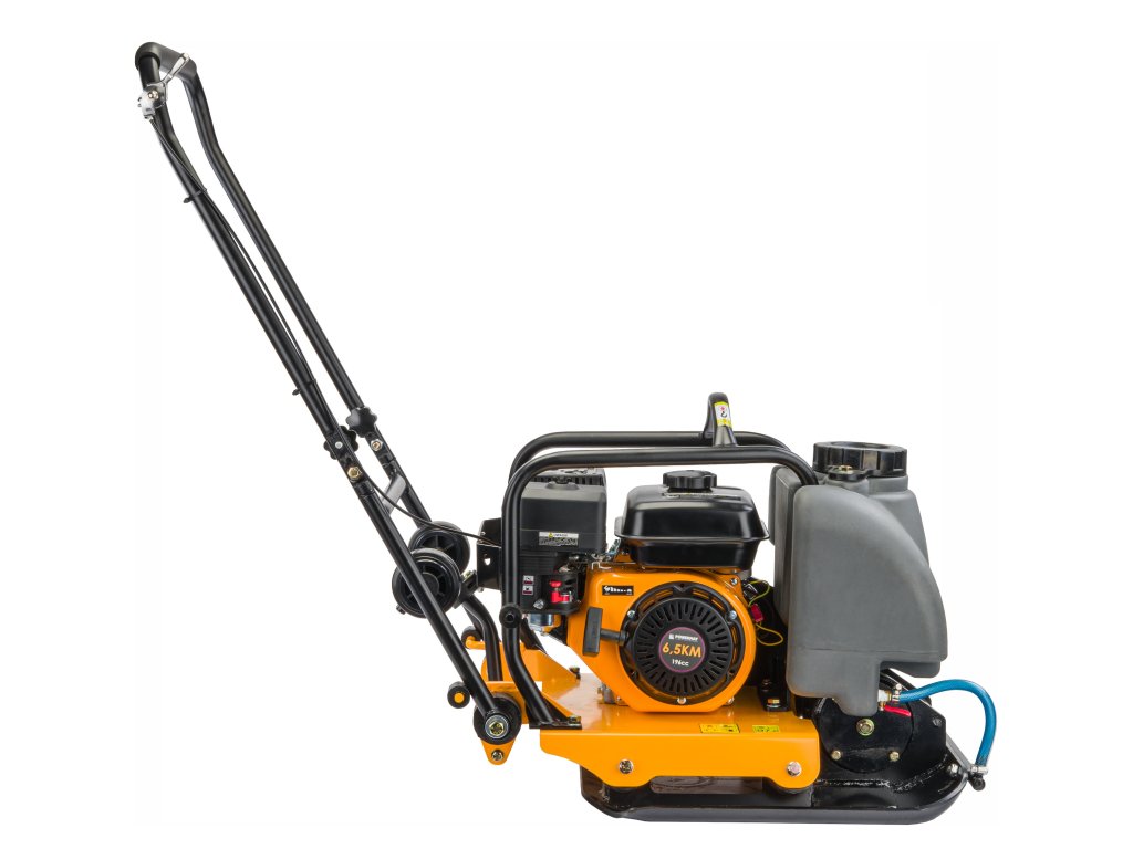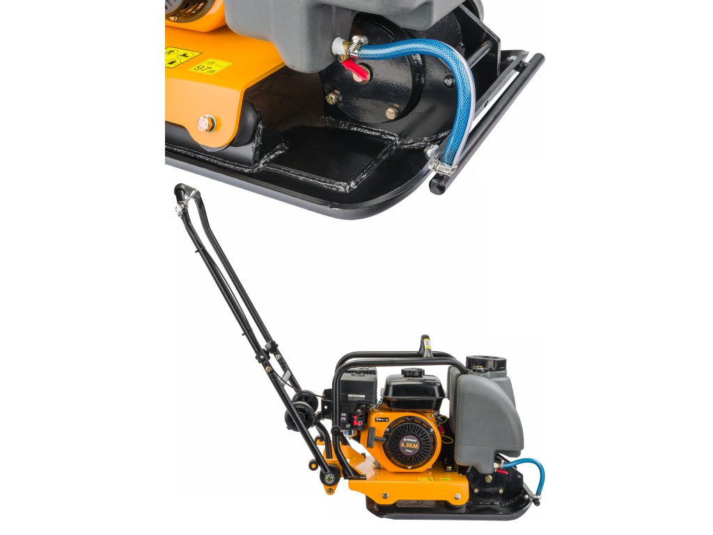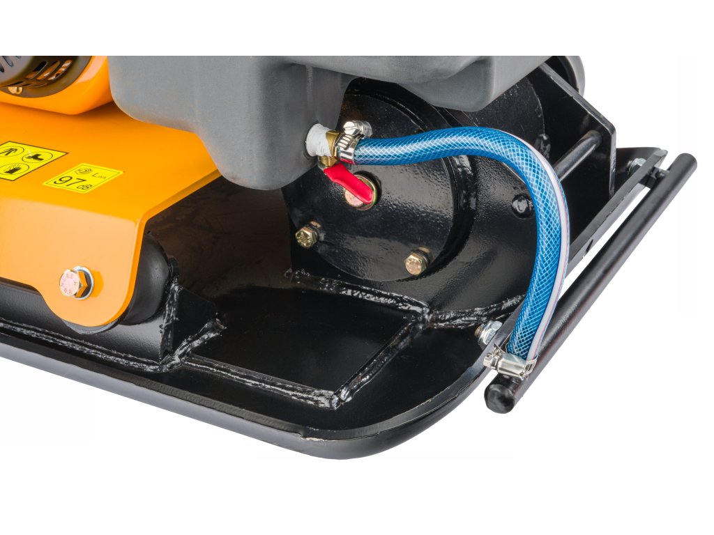 Rezervorul de apă cu supapă permite încărcarea suplimentară a plăcii de compactare și irigarea simultană printr-o țeavă metalică cu orificii.