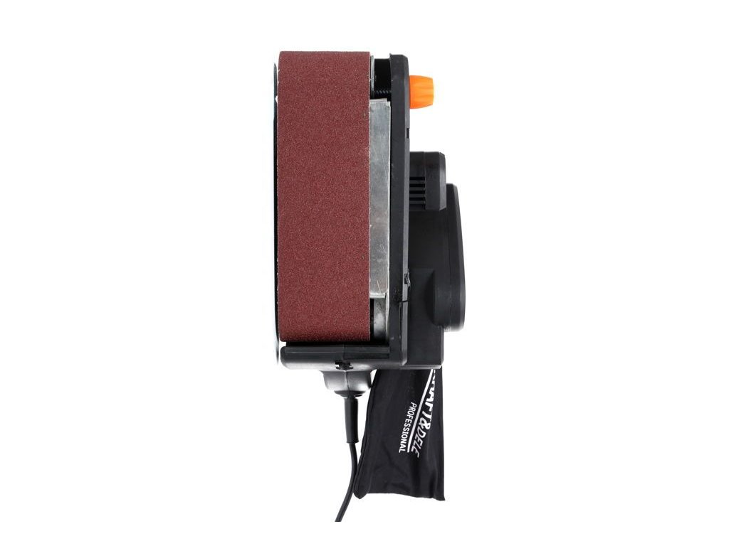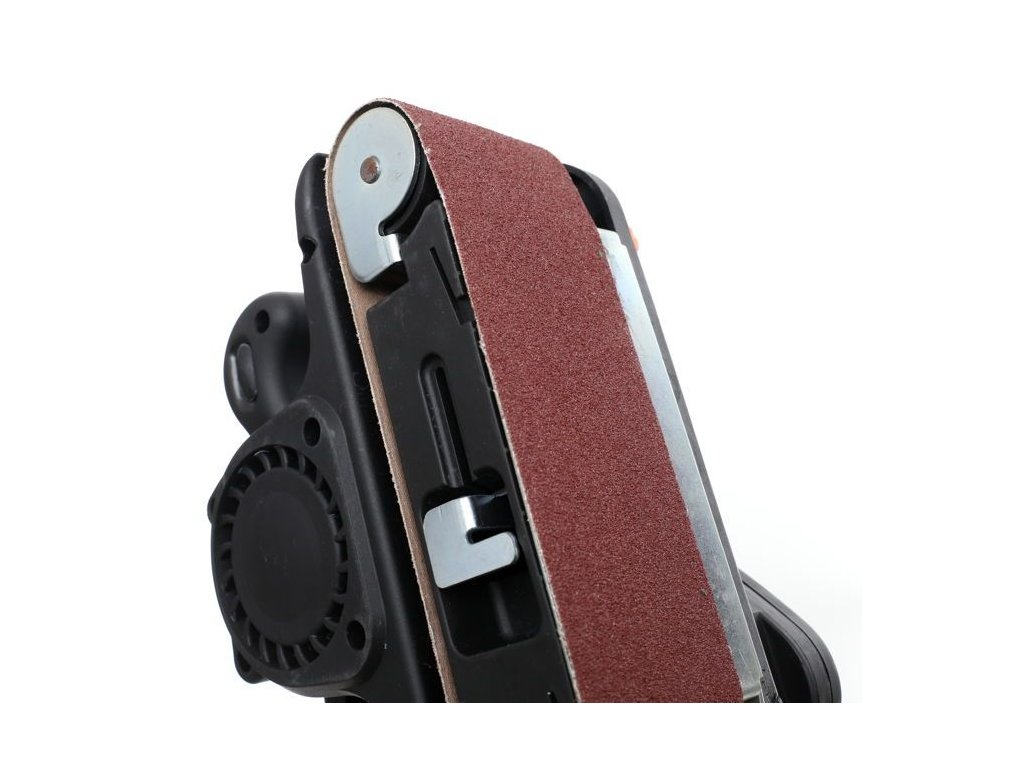 Schimbarea benzii abrazive se realizează fără unelte, este suficient să eliberați pârghia de tensiune a rolelor și să montați o nouă bandă abrazivă. Pachetul include și un sac pentru praf, pentru o muncă curată.