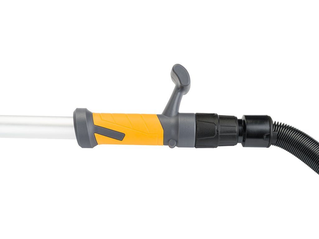 Polizorul este echipat cu un furtun pentru aspirarea prafului, care trebuie conectat la un aspirator industrial pentru a îndepărta eficient praful în timpul șlefuirii. Butonul de control permite reglarea simplă a turației.