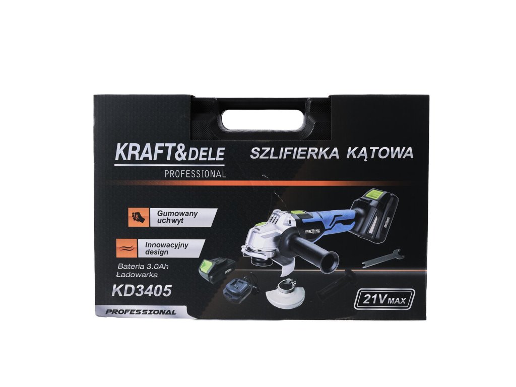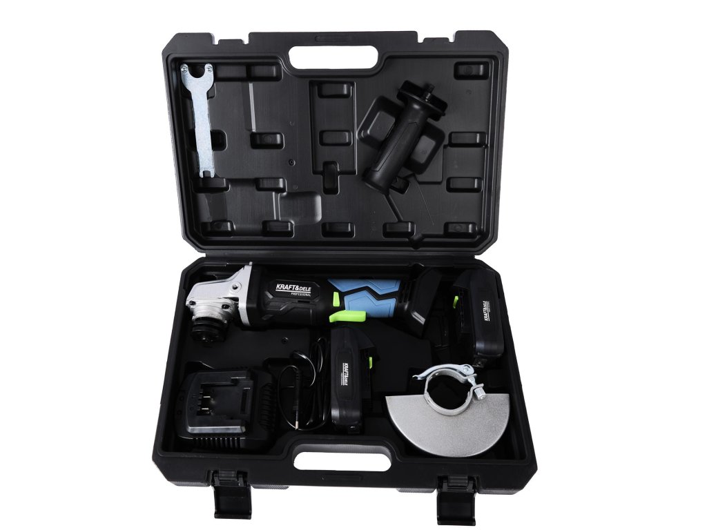 Polizor unghiular profesional fără cablu, marca Kraft&Dele, model KD3405. Setul este indispensabil pentru orice hobbyist sau profesionist. Setul este destinat tăierii, șlefuirii și lustruirii materialelor precum lemn, beton, plastic, ceramică, piatră și multe altele.