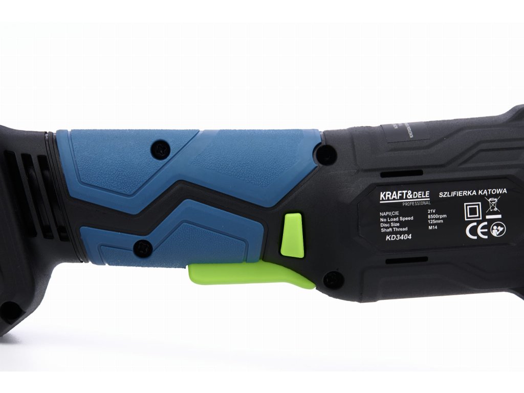 Polizor unghiular cu acumulator, brand renumit Kraft&Dele, model KD3404, destinat tăierii, șlefuierii și finisării materialelor precum lemn, beton, plastic, ceramică, piatră și multe altele. Construit pentru baterie 3000 mAh.