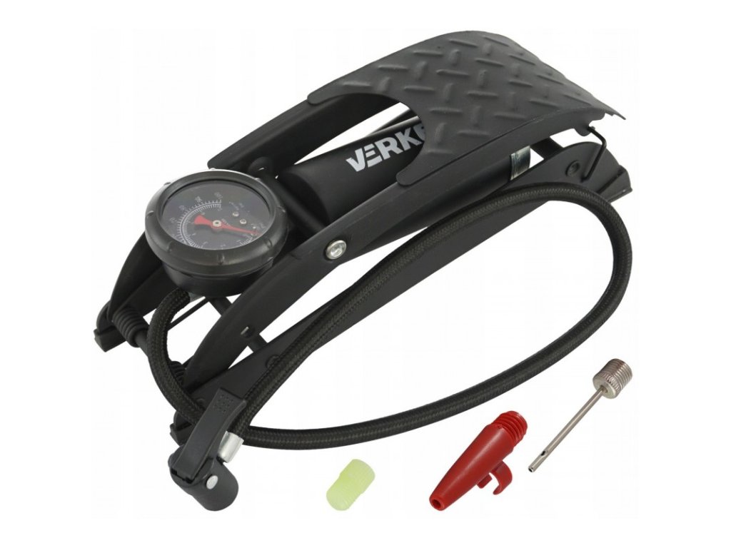 Pompă cu picior VERKE cu un singur piston . Pompa se caracterizează printr-o construcție solidă, realizată din tablă de oțel presată, vopsită, cu grosimea de 3 mm. Pedala este complet acoperită cu cauciuc pentru o aderență mai bună. Manometrul clar arată presiunea în bar (0-7) și PSI (0-100). Pompa are un furtun rezistent si flexibil . Pachetul contine doua adaptoare. Ideal atât pentru servicii profesionale, cât și pentru gospodării.