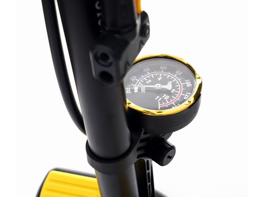 Pompa include un manometru încorporat pentru determinarea precisă a presiunii în anvelopă sau în alt obiect.