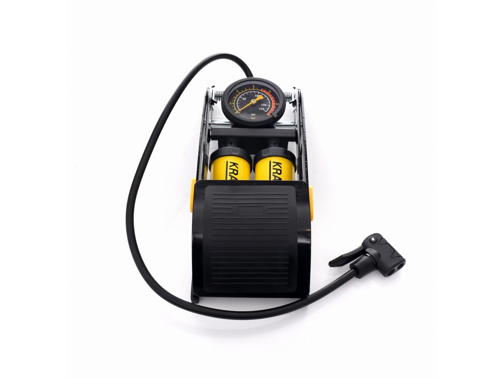 Pompă de picior cu manometru marca Kraft&Dele, model KD11824, destinată pentru umflarea rapidă sau reumflarea pneurilor bicicletei. Construcția cilindrului dublu acționat asigură o pompă mai rapidă decât o pompă obișnuită cu sistem cu un singur cilindru.