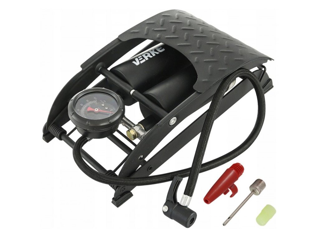 Pompa cu picior VERKE cu piston dublu este concepută pentru toate nevoile dumneavoastră de umflare. Această pompă cu o construcție solidă este realizată din tablă de oțel presată și vopsită cu grosimea de 3 mm, ceea ce îi asigură o durată lungă de viață.