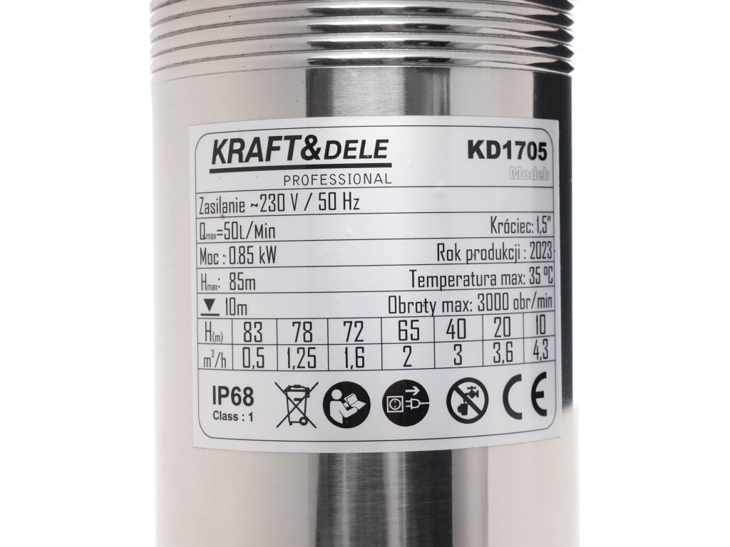 Pompă submersibilă de adâncime marca Kraft&Dele, model KD1705, este dispozitivul ideal pentru extragerea apei curate și pentru funcționarea în sisteme hidrofor. Dispozitivul este adaptat pentru extragerea apei pentru alimentarea caselor de locuit și a terenurilor de recreere. Pompa are randament înalt și, în același timp, este economică; este fabricată din aliaje metalice solide. Motorul pompei este echipat cu protecție termică modernă.