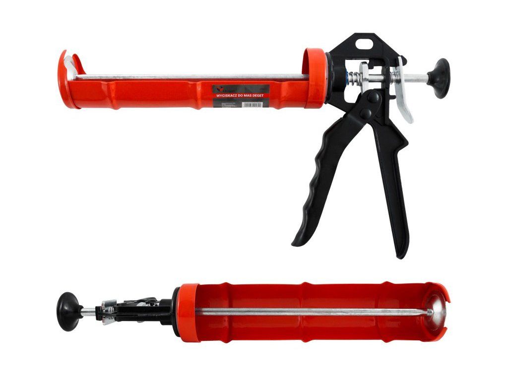 Presă pentru materiale dense . Ușoare, din tablă de oțel, vopsită. Mânerul confortabil, profilat, ergonomic permite aplicarea eficientă a materialelor groase precum silicon, adezivi, etanșanți, lubrifianți etc. Designul ranforsat crește forța și eficiența aplicării, ceea ce este deosebit de important atunci când extrudați substanțe groase și lipicioase.