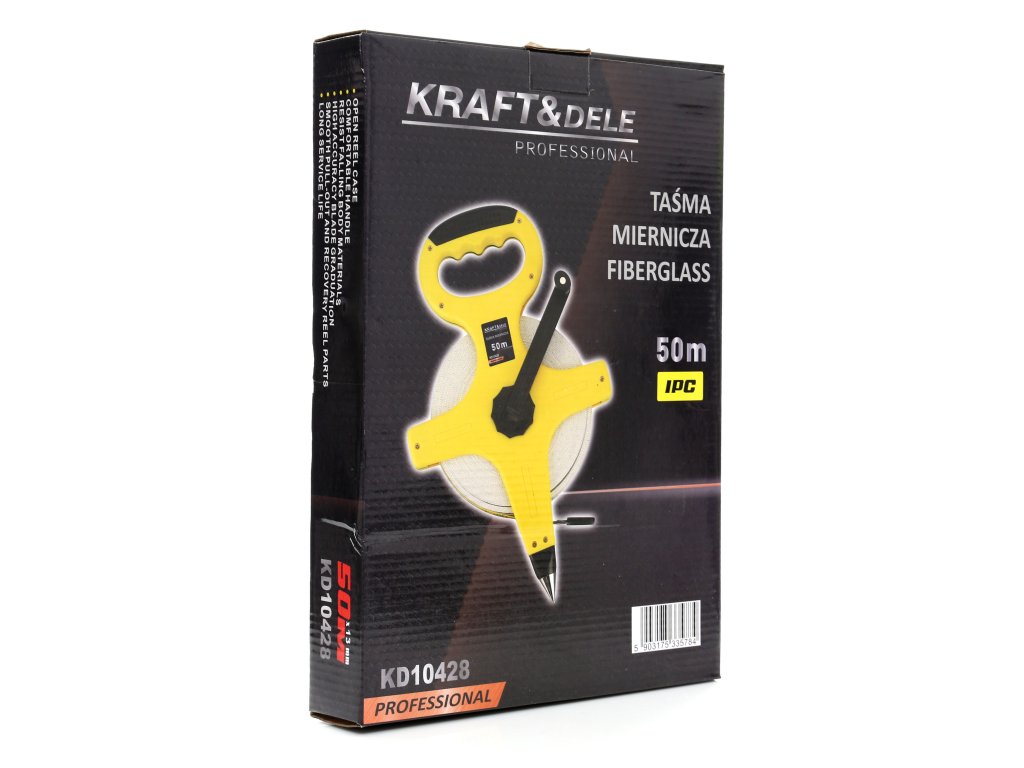 Ruletă din fibră de sticlă 30 m KD10427. Bandă de măsurat profesională marca Kraft&Dele. Este rezistentă la intemperii, prevăzută cu vârf pentru înfipt în sol, facilitând măsurarea independentă. De asemenea, util este și șnurul atașat la capătul benzii pentru manipulare ușoară de către o singură persoană. Ergonomia muncii este asigurată de mânerul confortabil și tamburul cu înfășurare lină.