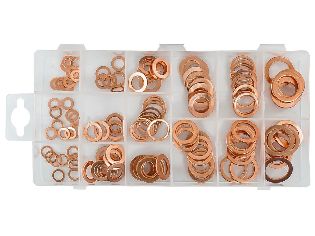 Set șaibe din cupru pentru utilizare în atelier. Întregul set este ambalat într-o cutie practică de plastic cu separatoare care asigură ordinea și sortarea corectă a dimensiunilor tampoanelor.