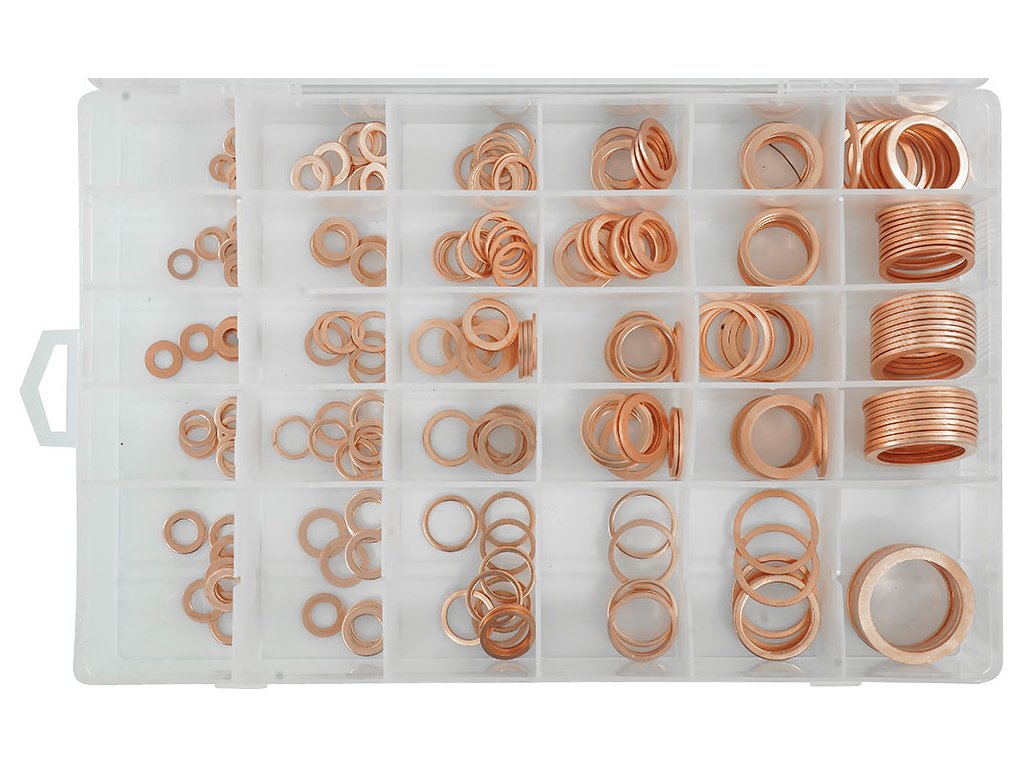 Setul contine 300 de bucati de saibe de cupru in dimensiuni de la 5x9x1 mm la 28x36x2 mm .